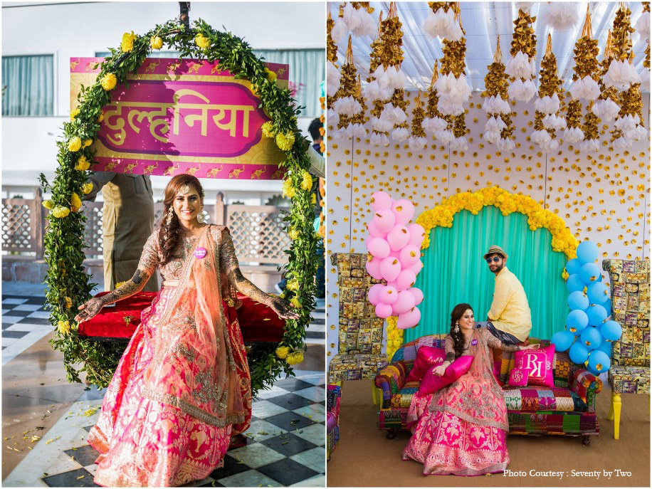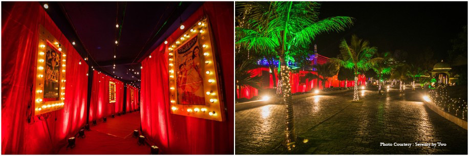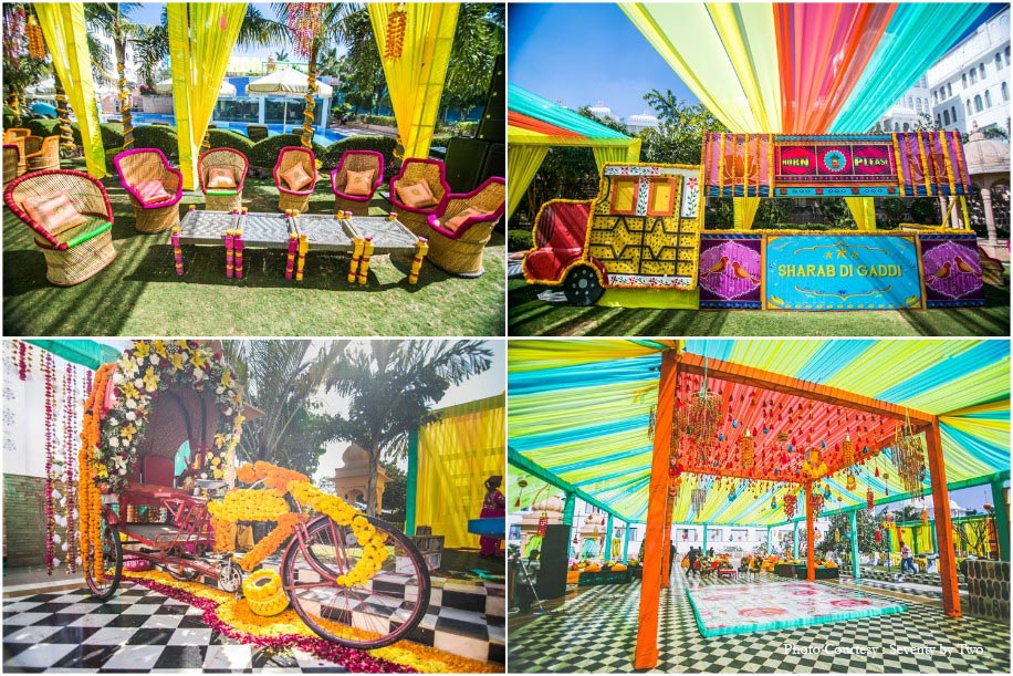 The mehndi was hosted during the day with a carnival theme. Rajasthani dancers and Punjabi folk dancers kept the guests entertained. A lac bangle maker was present alongside tarot card readers. The Flaming Trio performed at the bar and mesmerized everyone and a fun pool party was hosted later in the late afternoon right after the mehndi. This Hawaiian themed party witnessed flamingo tubes among some kitschy décor elements.