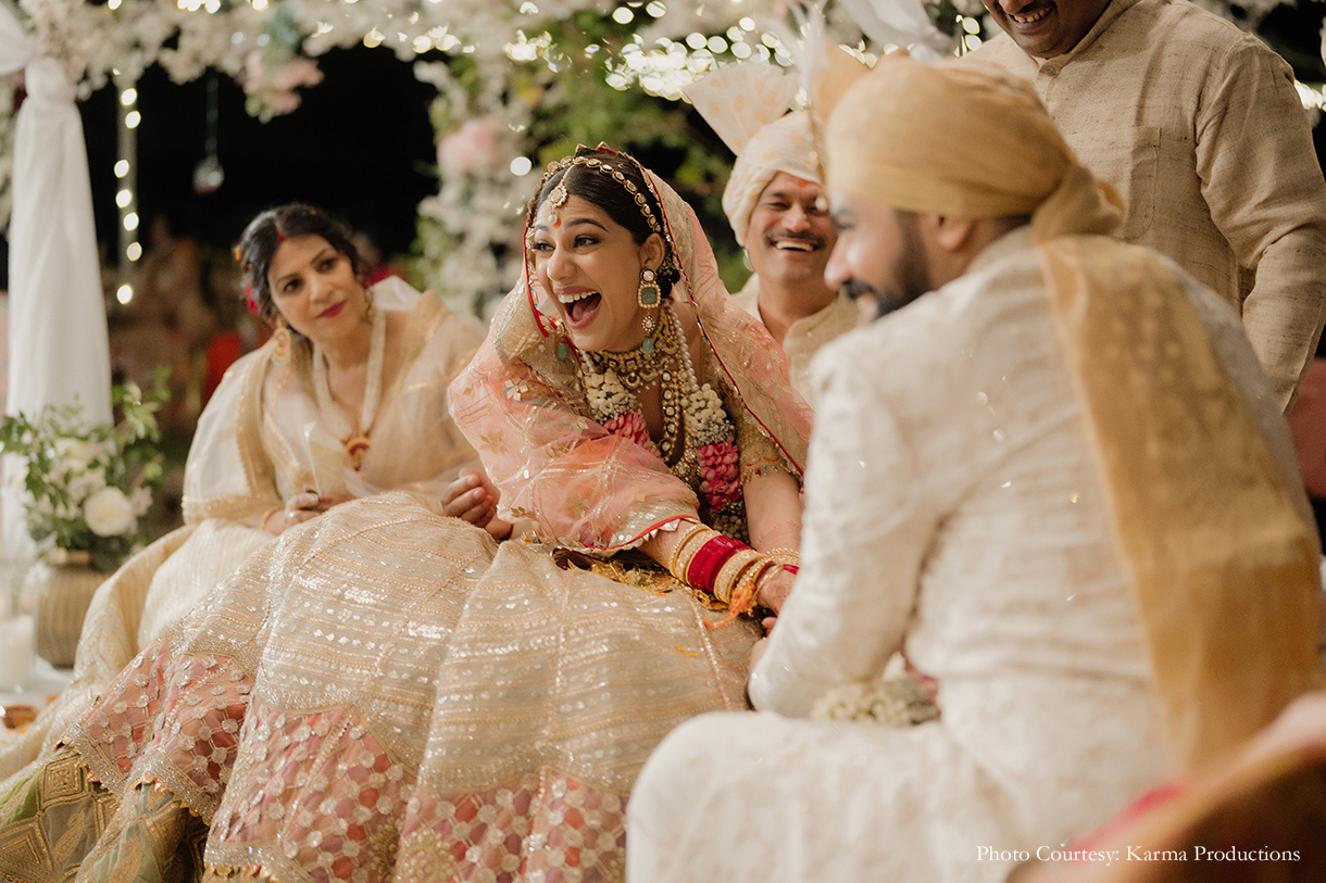 Photographing the couple as they tied the knot was Karma Productions. Impressed by the photography team’s dedication and creativity, the ecstatic newlyweds shared, “We loved everything about them. The only thing we felt after receiving the final deliverables was that we didn’t give them enough time to capture everything! Before the wedding, we had planned extensively for various scenarios, frames, and the story we wanted to portray. We are incredibly grateful that we chose Karma Productions to capture it all. They were attentive throughout the event and captured everything beautifully. We were thrilled with the final product, and our families also appreciated our choice of such a wonderful and courteous team that delivered fantastic photos and videos.”