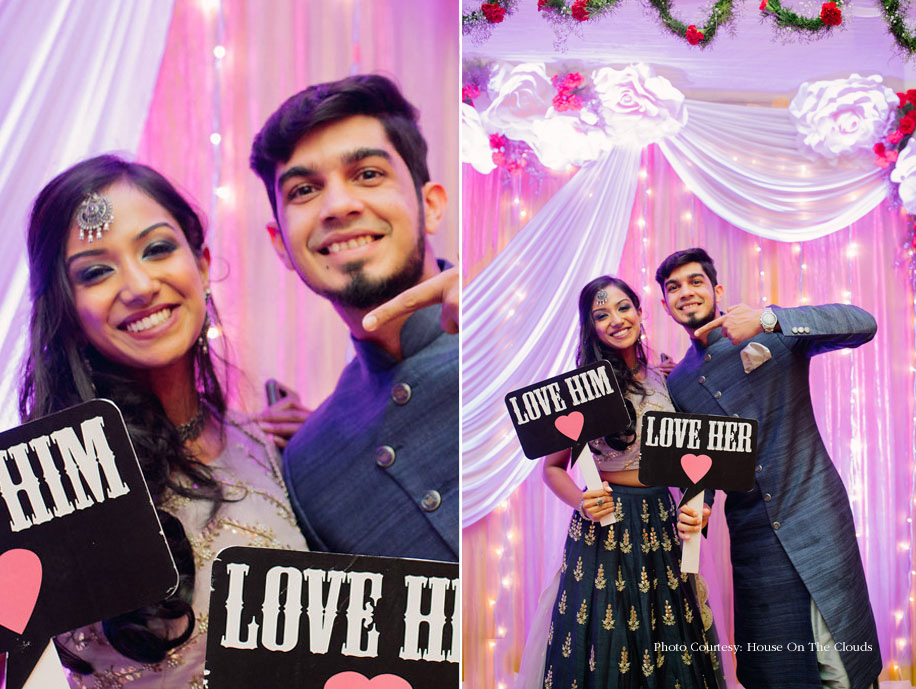“After the formal events, it was time for us to have a function where all our loved ones could relax and have some fun. So, we hosted a cocktail party for which I wore a jewel tone lehenga by Payal Singhal that was paired with a white blouse and dupatta, and Abhay opted for a sherwani. We had also created a photo booth that featured large white paper flowers that were accented with some fresh red blooms and fairy lights.”