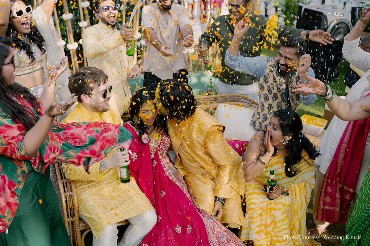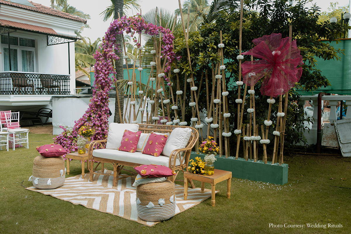 The couple shares, “For our Haldi, we wanted something a little different, so instead of the usual yellow tones, we went with a vibrant mix of pink and yellow, inspired by the beauty of Bougainvillea blooms. We had a gorgeous bamboo backdrop designed that felt natural and earthy, yet completely elegant. It was a day filled with laughter, color, and joy, surrounded by the people we love most.”