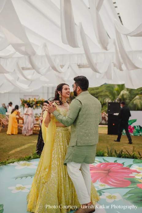 Roshni and Adhiraj’s wedding celebration began with a charming floral Mehndi soiree. Imbibed with the sweet scent of fresh flowers, the gorgeous open space was set up with minimalistic decor of white satin drapes woven to craft a canopy of swift summer clouds. Wicker furniture, exotic floral arrangements, and the arched center stage all added to the Bohemian Pinterest-ty vibe of the occasion. The bride sported a yellow lehenga by Seema Gujral, while the groom donned a green kurta from NM Studio.