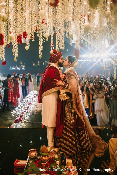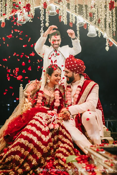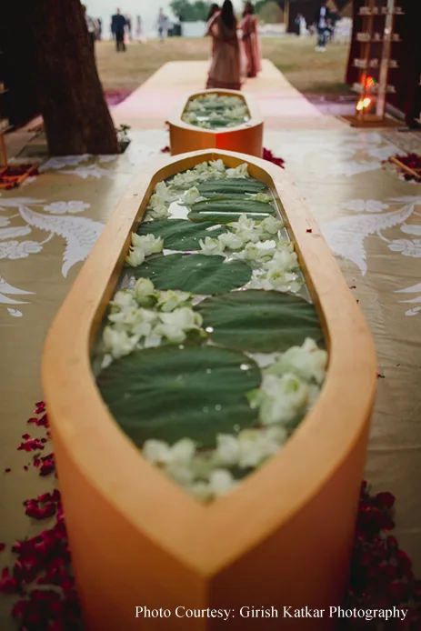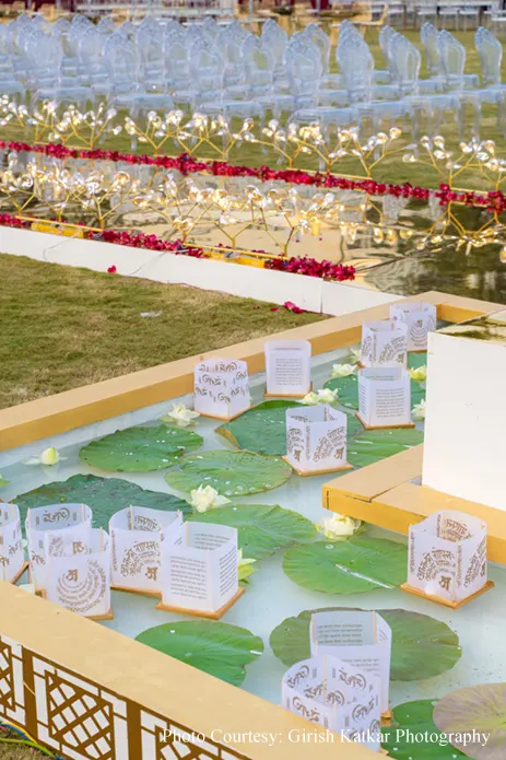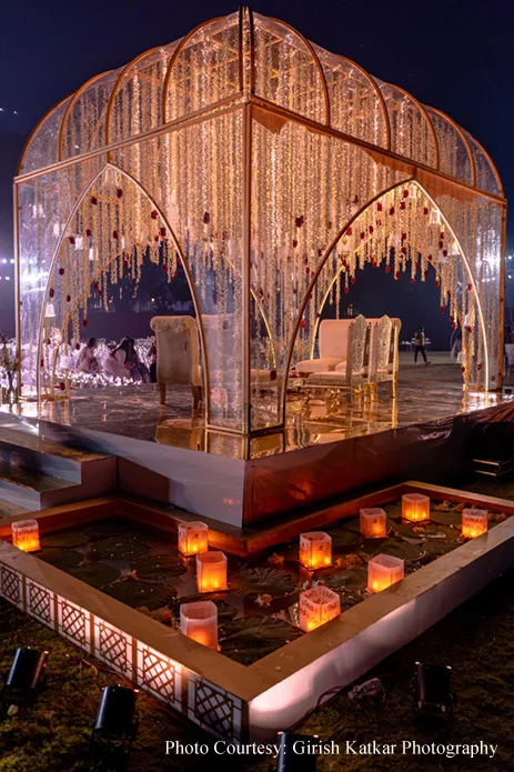The simple yet magical lakefront wedding was a true celebration of the couple’s story, composed of elements that represented their love. A glistening mirrored aisle flanked with eclectic gold decor and rose petals led to the stately mandap, a metallic structure hung with a beautiful canopy of white and red blooms. Water bodies filled with lilies and floating messages with candles symbolized the institution of marriage and a sweet ode to the couple. Acrylic chairs, pristine white sofas, and ornate metallic dividers full of candles further added to the ethereal aura of the occasion. The ceremony was full of emotions and happiness as the couple’s loved ones blessed their union.