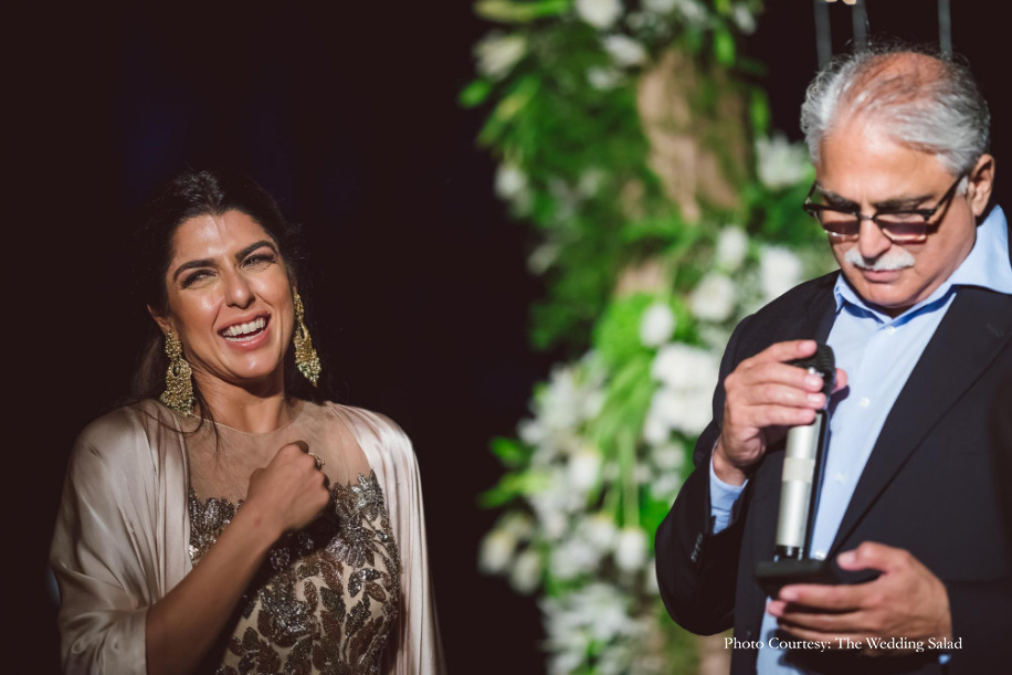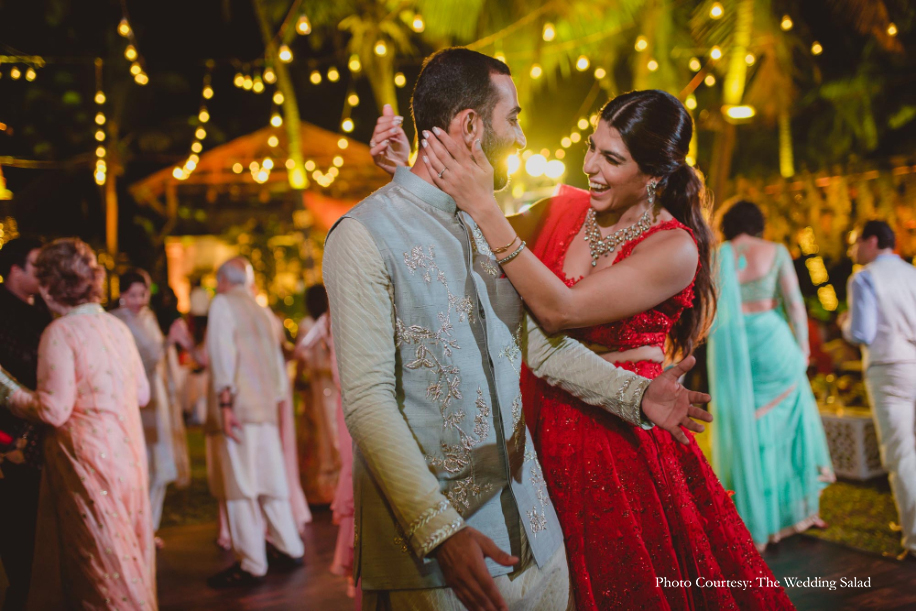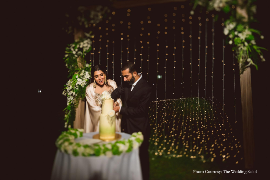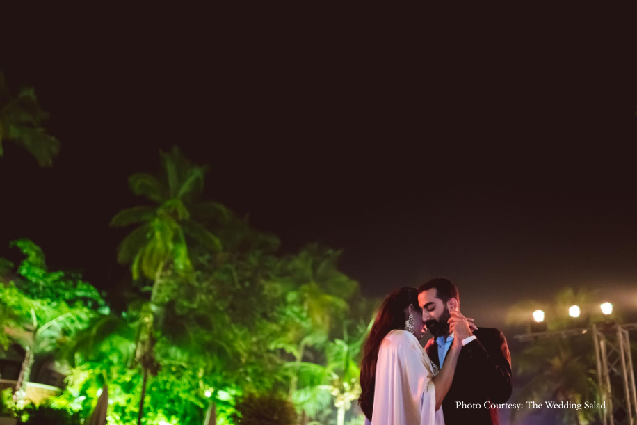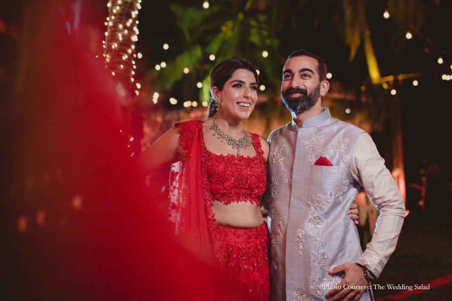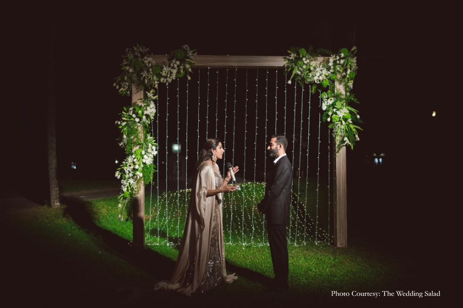 The reception took place on The Western Waterfront where Mad Orange Fireworks along with DJ Jasmeet rocked the party with his tunes. Hundreds of twinkling fairy lights and floral arrangements on tables made the outdoor venue look enchanting. The couple made an entry at their reception and exchanged vows and rings in front of their loved ones. They promised to cherish each other in sickness and health. The couple’s closest friends and family members gave heartwarming speeches. The evening concluded with the couple dancing to special tracks.