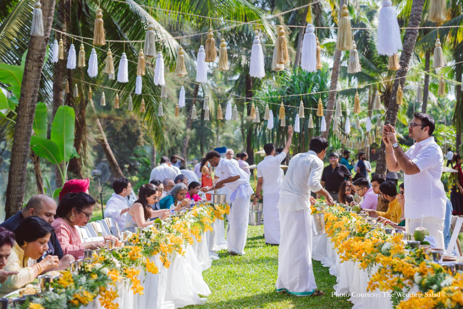 The couple hosted a traditional Kerala lunch called the ‘sadhya’ which was hosted along the hotel’s lawns facing the beautiful backwaters. Rubah looked radiant in an Anamika Khanna outfit, and Siddharth complemented her in a blue kurta from Fab India and a ‘kusavu mundu’ (Kerala-style dhoti). The decor had a color palette of bright yellow and green in the form of fresh floral arrangements.
