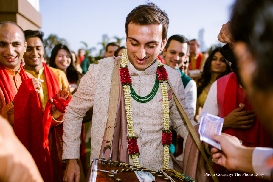 Bride Ruchi’s haldi ceremony was a close-knit affair at the Malabar Hill Club where the haldi was applied only to her toes. This was then followed by a pre-wedding dinner. The bride donned a pretty ochre attire for this event. Groom Amay’s haldi was a more intimate function held at The Trident with that one set a little differently as compared to Ruchi’s. He was dowsed not only in haldi but also mustard, ketchup, Thai curry, chocolate sauce, and anything else his friends could find!