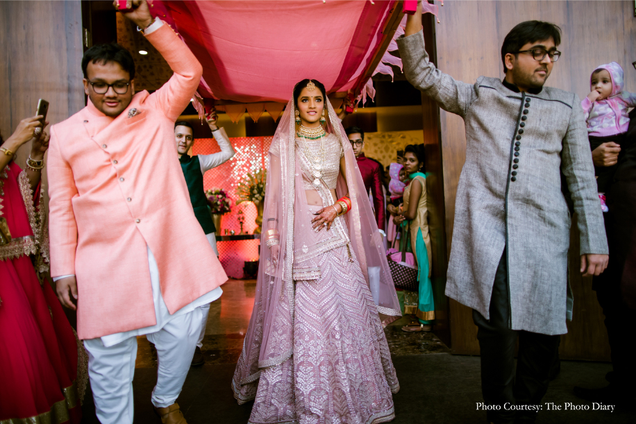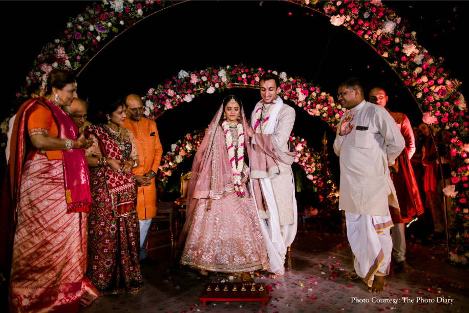 The wedding ceremony was a beautiful one with hues of red and pinks adorning the venue. Another interesting decor element was the hanging bells which further added a traditional touch. Practicing equality here, Ruchi entered with a baraat too as did Amay. However, both baraats made an energetic entry via different parts of the terraces. The bride looked gorgeous in a rose pink gota lehenga with a contemporary blouse while the groom donned an off-white sherwani over a draped kurta. The addition of a rose pink shawl and pocket square to Amay’s look was a sweet gesture meant to complement Ruchi’s ensemble.