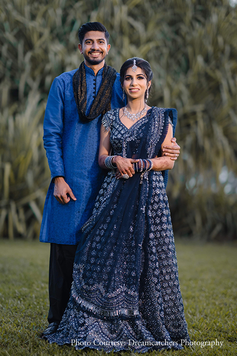 The wedding ceremony was held on the beachside lawns of the hotel. Azure drapes along with yellow and white flowers perfectly paired with the backdrop of the sea and coconut trees. Sparklers, along with a beautiful sunset that painted the skies orange, served as the picture-perfect frame as the couple exchanged wedding vows. The bride’s younger sister performed the rituals and, soon after the pheras, the couple took off in a vintage car with happy smiles on their faces. The bride dazzled in a soothing champagne and blush pink ensemble for the pheras, while the groom wore a royal blue sherwani by Manyavar.