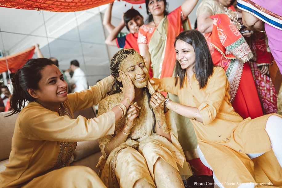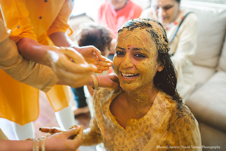 Saachi had an intimate haldi ceremony with just her immediate family members and close friends in attendance. She wore a cheery yellow suit for the ceremony, and all her family members color-coordinated their ensembles with her.