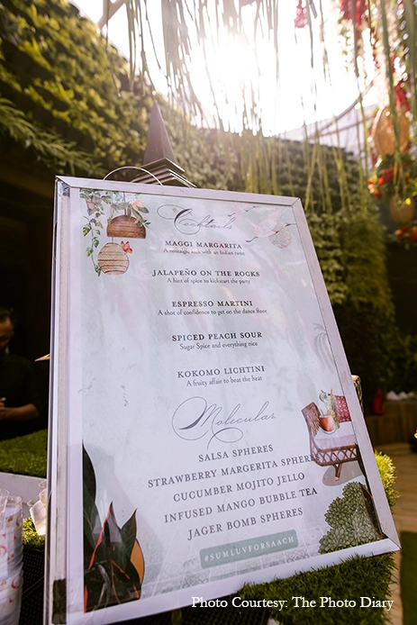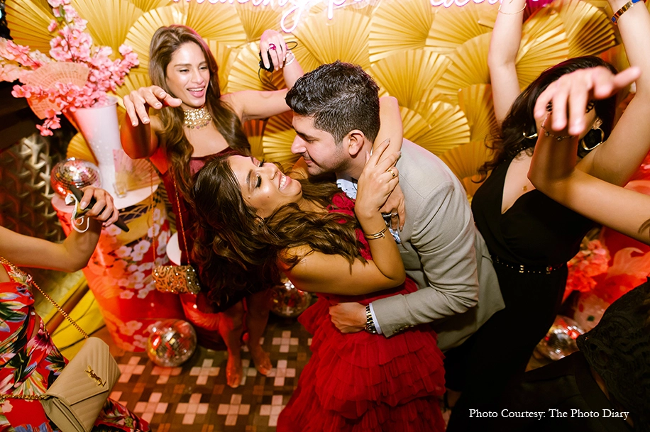 The bride’s childhood in Japan inspired the cocktail function at Koko Restaurant in Mumbai that kicked off the celebrations. From drinks to decor, the night was brimming with Japanese oriental flavors. A ‘Konichiwa’ welcome sign beckoned the guests inside, while cherry blossom arrangements, Japanese paintings, traditional folding fans, rice paper lanterns and more, added to the magical vibe. Dressed in a ruffled pink gown and a suave grey suit respectively, the bride and groom enjoyed with their posse clicking pictures, drinking and dancing.