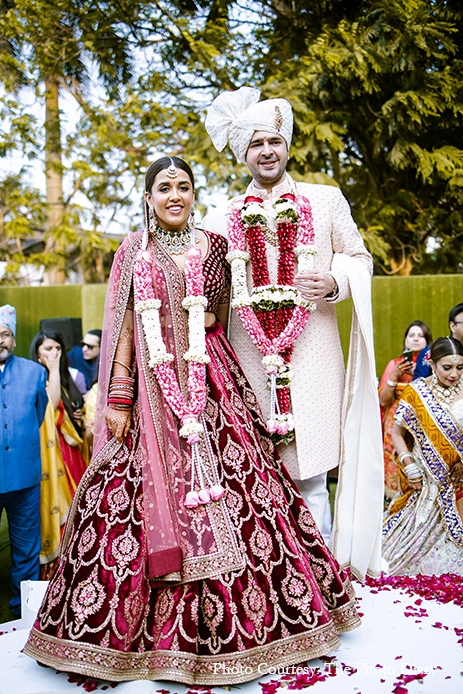 The lush outdoor wedding saw quaint white decor with flowers, foliage and whimsical crystal strings. The wedding was a heartwarming, romantic affair full of warm family moments and tender traditions. The bride dazzled in a rich maroon lehenga, which was perfectly complemented by the groom’s elegant cream-hued sherwani. The ceremony was followed by a lively Reception dinner highlighted by fairy lights, cake-cutting, warm speeches, music and laughter!