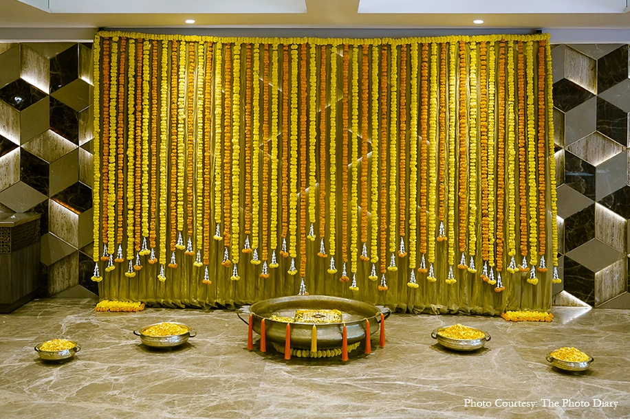 The bride’s Haldi was an intimate, indoor function at Status Restaurant, Mumbai with an elegant, minimal decor of marigolds. Saachi was seated in a traditional brass vessel for the ceremony, and she was playfully doused with turmeric paste and flower petals by her loved ones. She opted for a soft, floral lehenga with a shimmering silver blouse for the occasion.