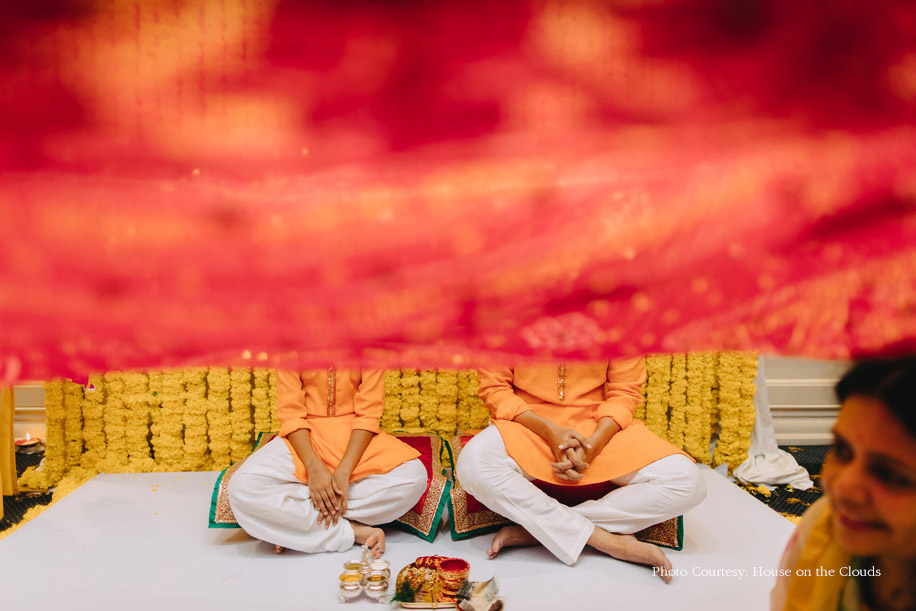The haldi ceremony was an intimate affair with only the close family and friends in attendance. A beautiful setup was created with fresh florals making it an elegant affair. The vibrant decor for the function included shades of yellow in elements such as drapes and flowers, which turned out to be beautiful and cheery.