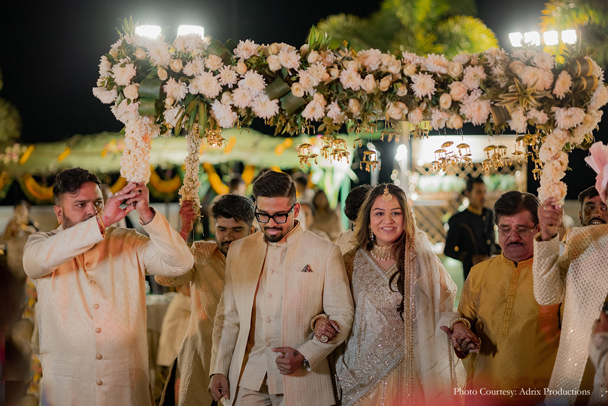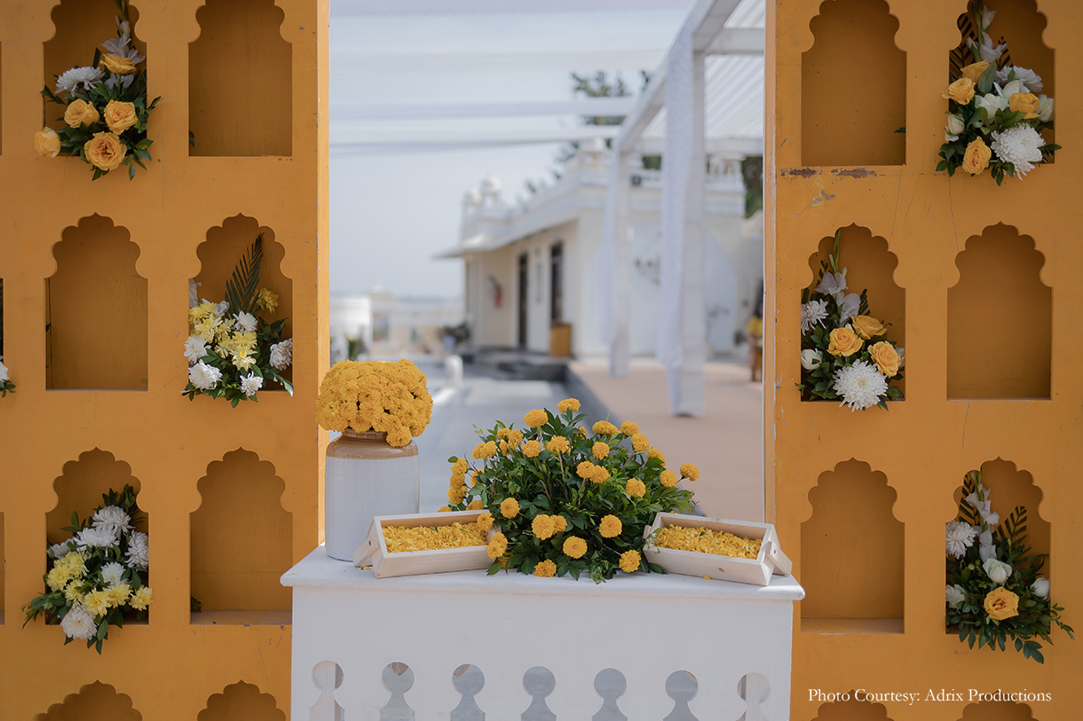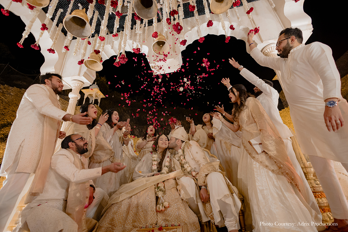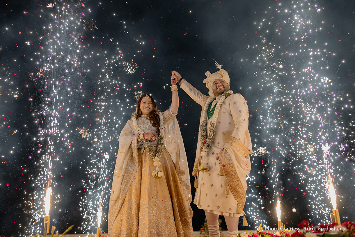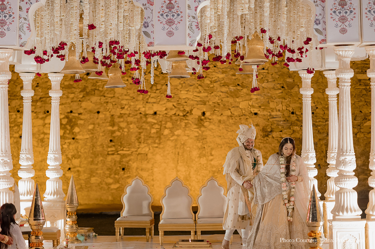Channeling the grandeur and palatial glory of the property, the wedding ceremony was straight out of a fairytale. Dressed in ivory, the bride entered the wedding mandap with her brother and dad by her side while her cousins held the Phoolon ka chadar, and the couple exchanged garlands amidst a grand display of fireworks and flower showers. A special station was set up with customized cones filled with flower petals for guests to shower them with blessings, along with bells to ring as they tied the knot.