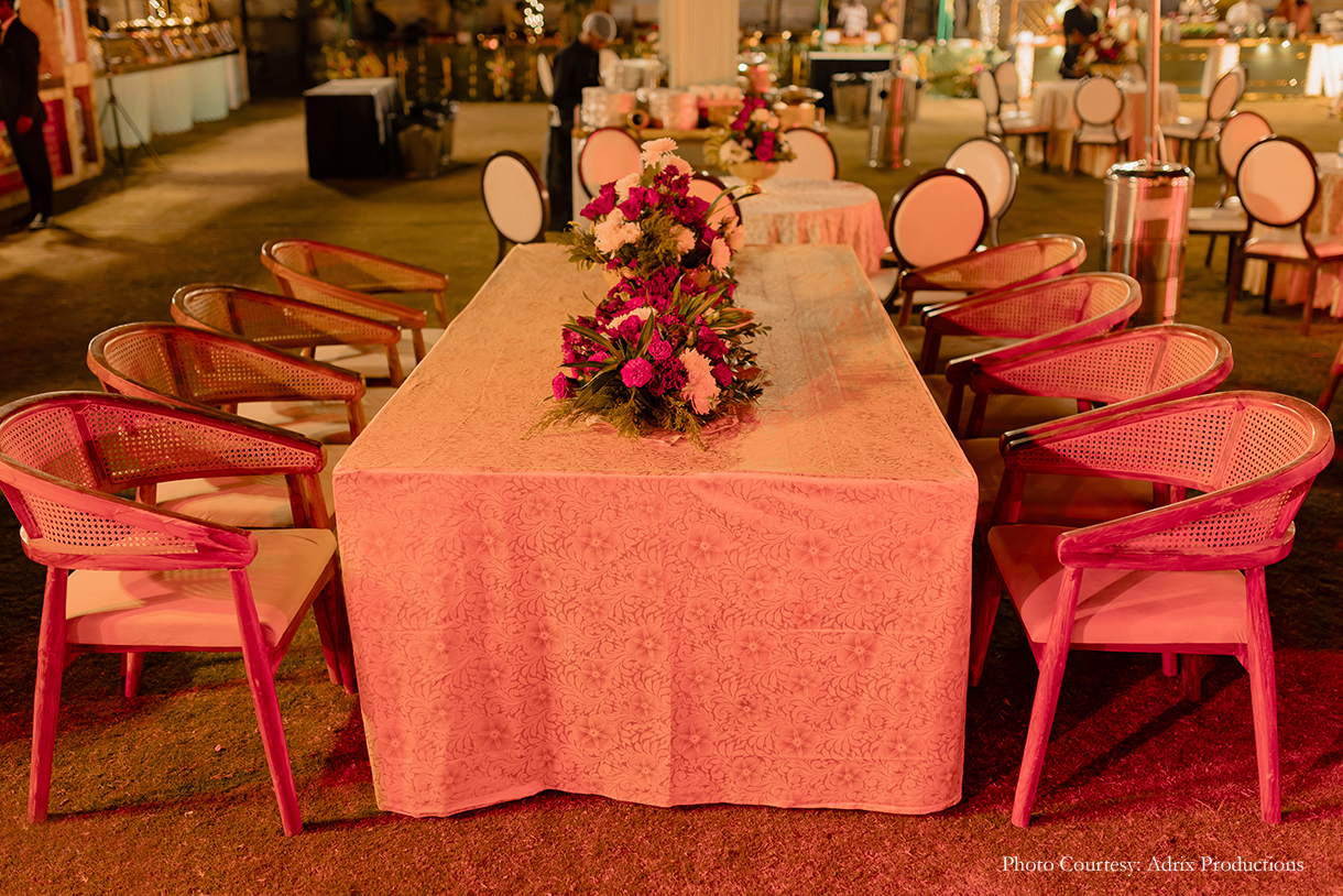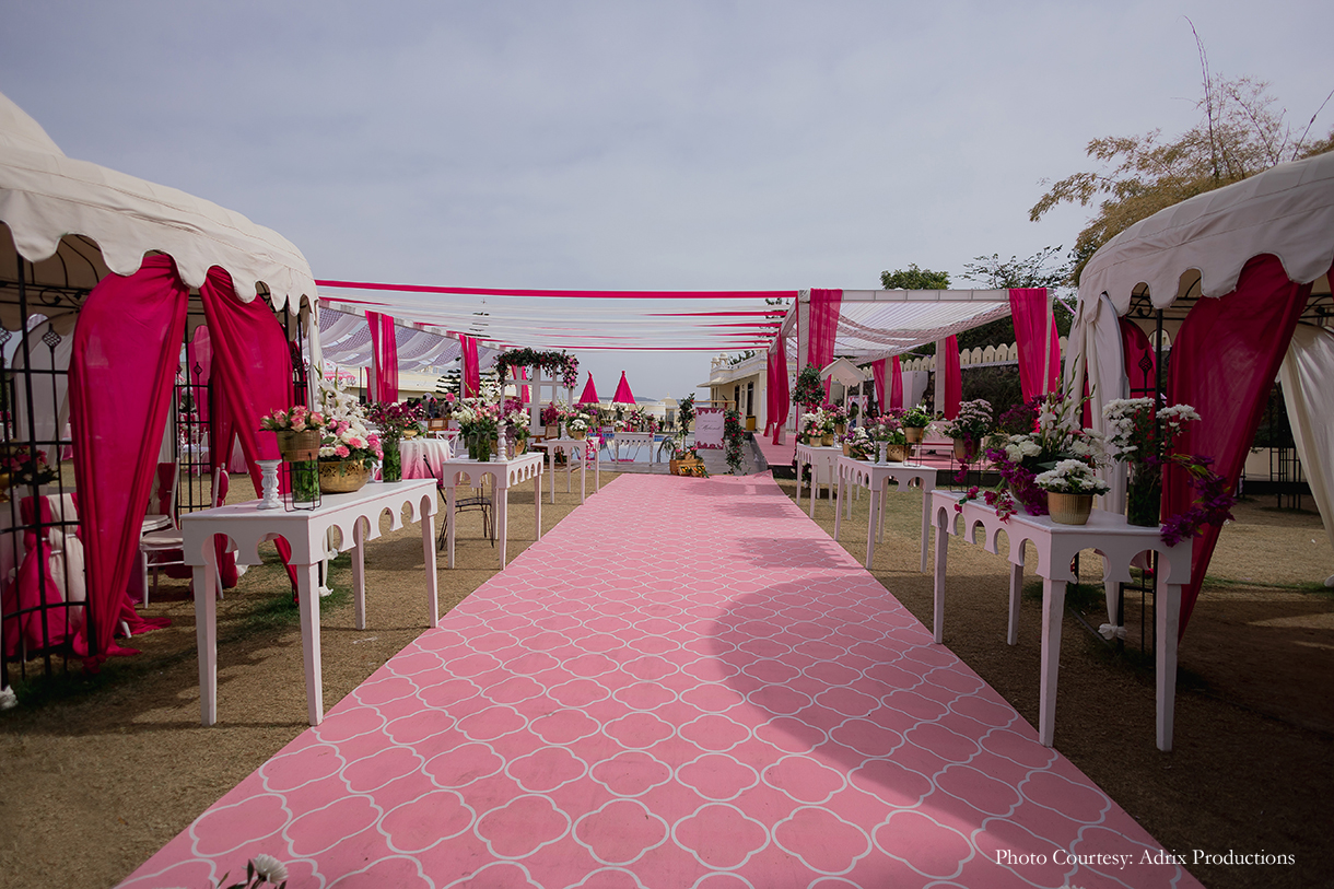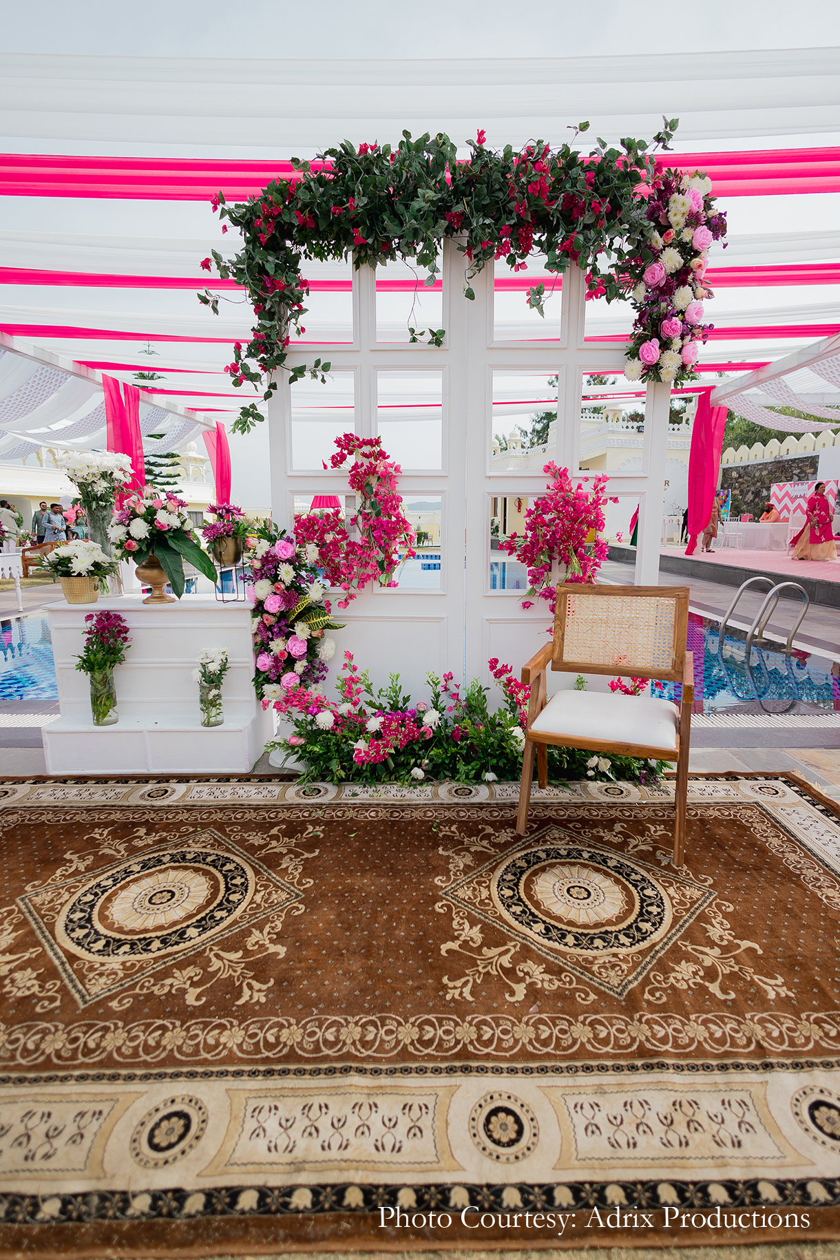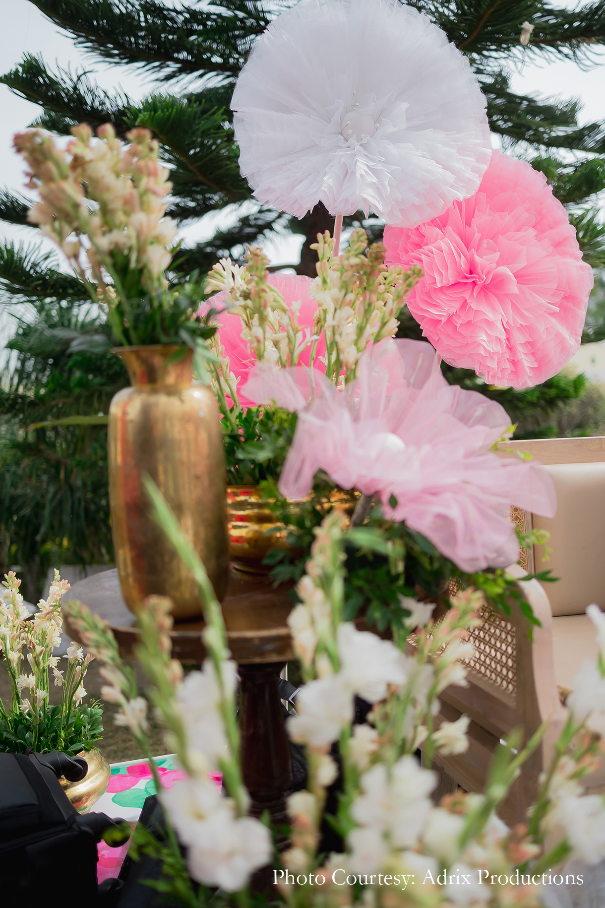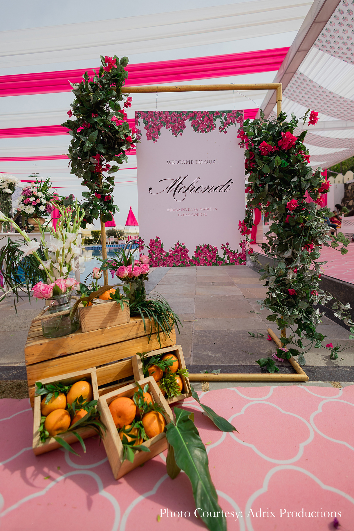Kicking off the festivities, the Mehndi ceremony was a vision in pink, full of vibrant bougainvillea flowers, flowing drapes, 3D tulle flowers, baskets of fruits, and more. The lush blooms and delicate hues created an enchanting atmosphere, as the guests got their hands painted with henna and enjoyed lively music.