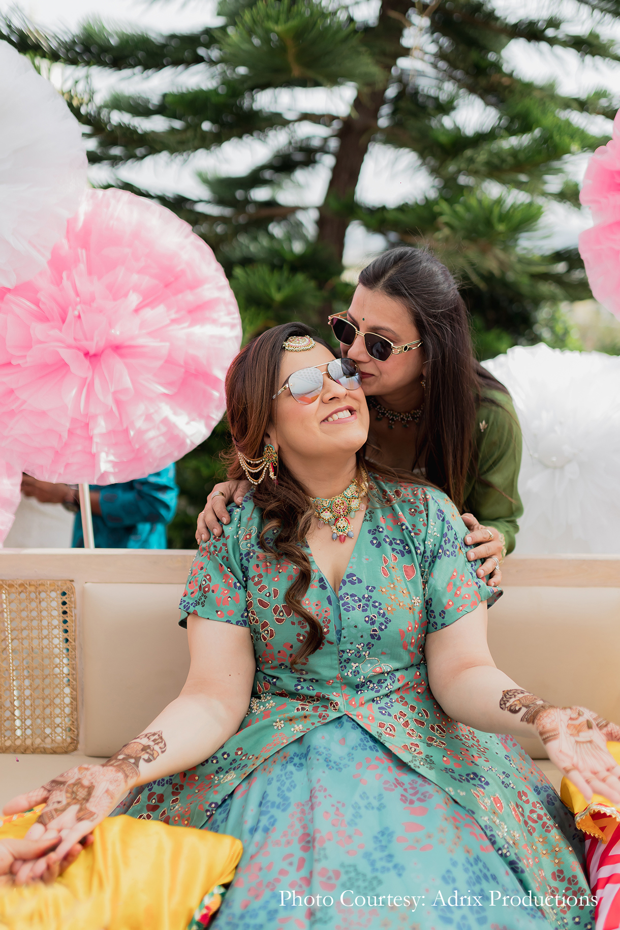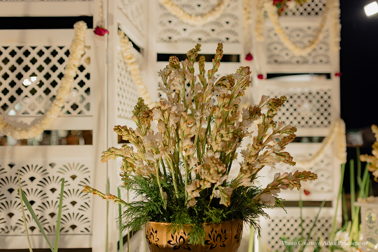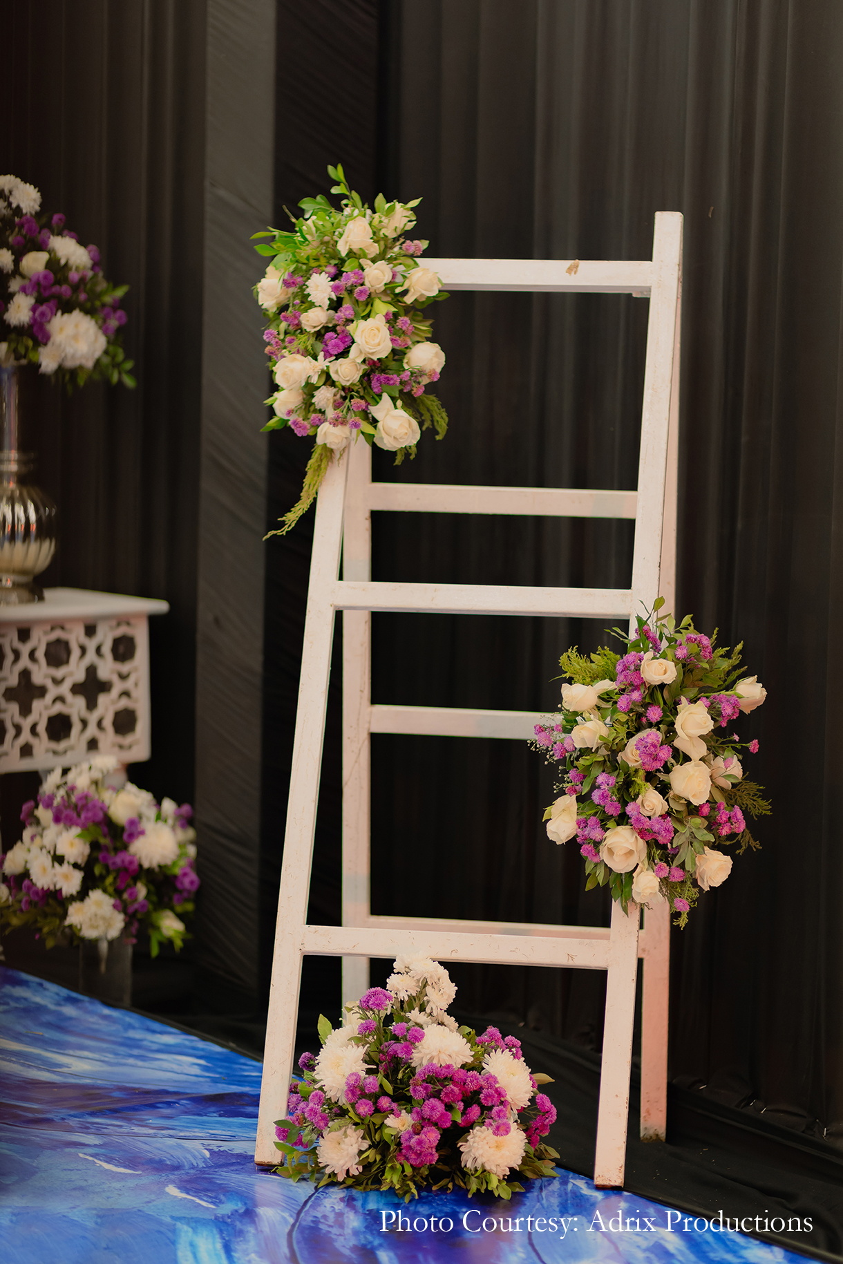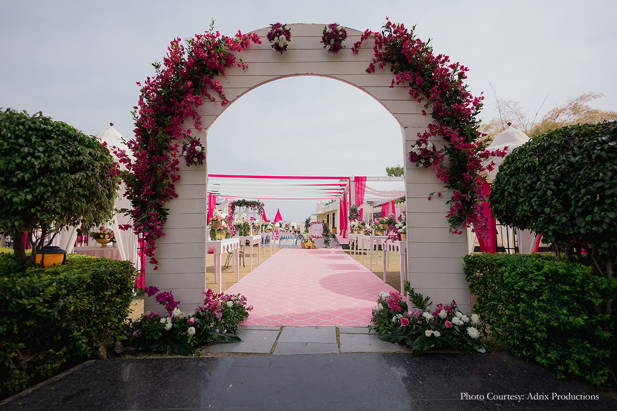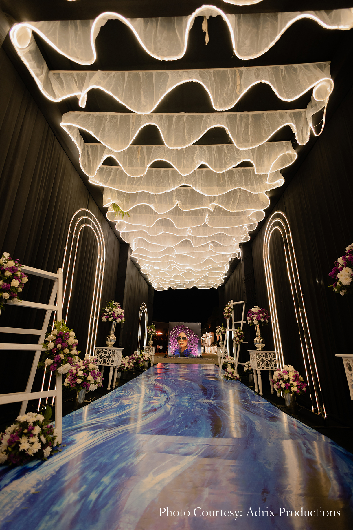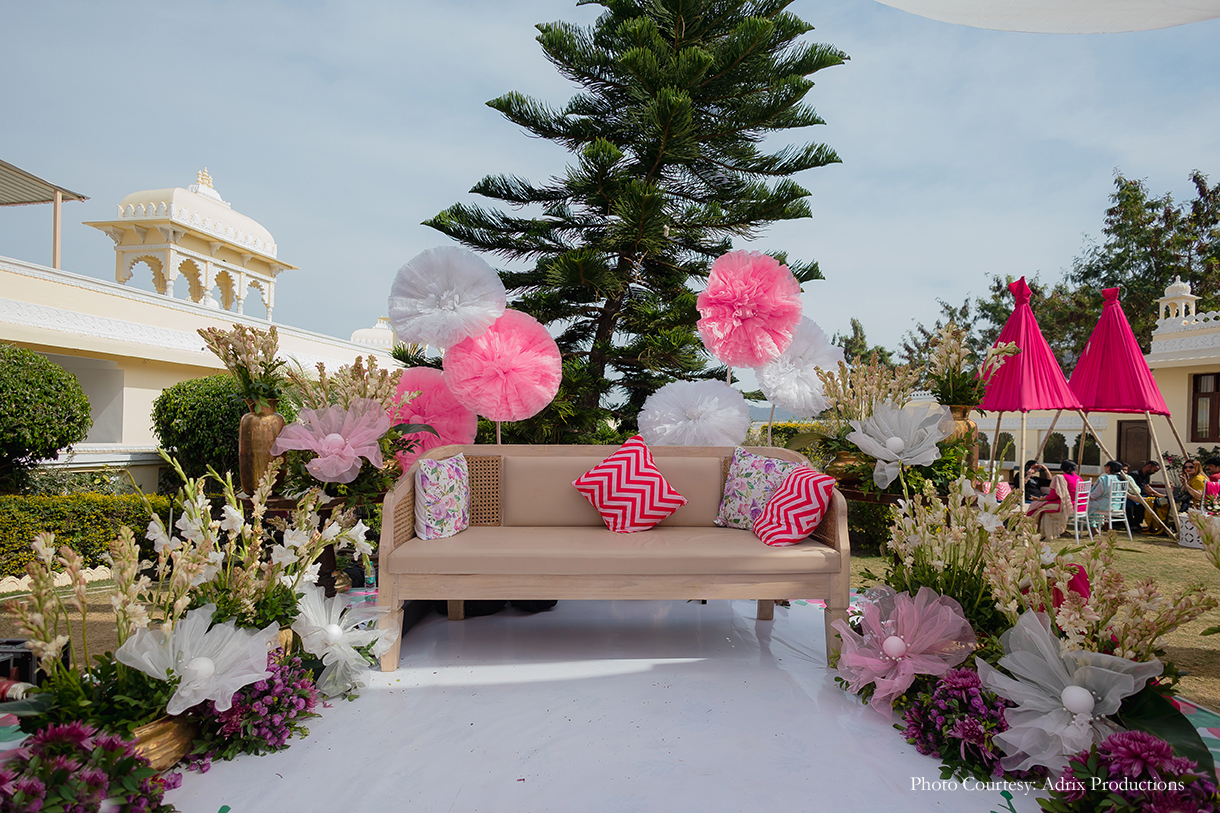 Kicking off the festivities, the Mehndi ceremony was a vision in pink, full of vibrant bougainvillea flowers, flowing drapes, 3D tulle flowers, baskets of fruits, and more. The lush blooms and delicate hues created an enchanting atmosphere, as the guests got their hands painted with henna and enjoyed lively music.