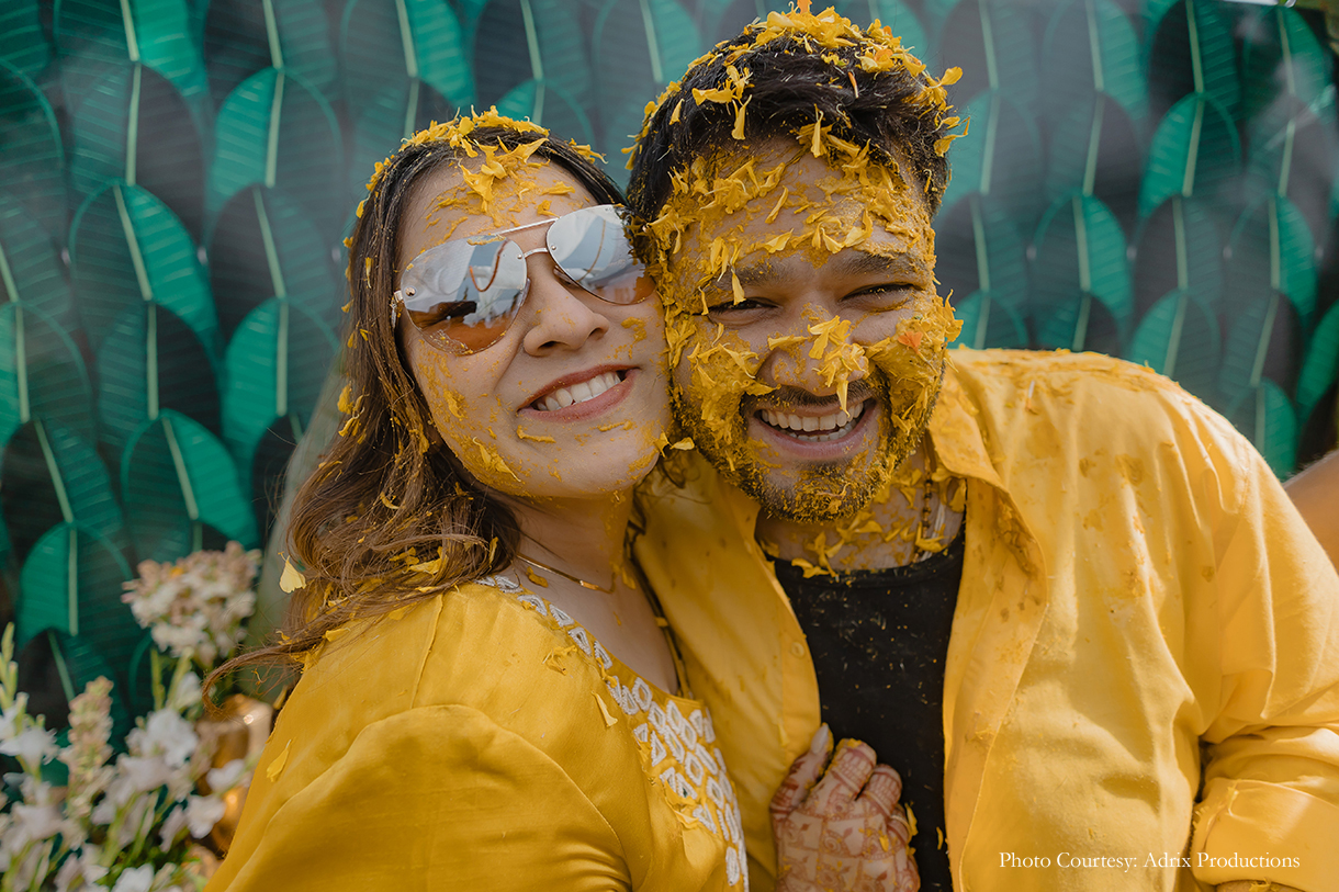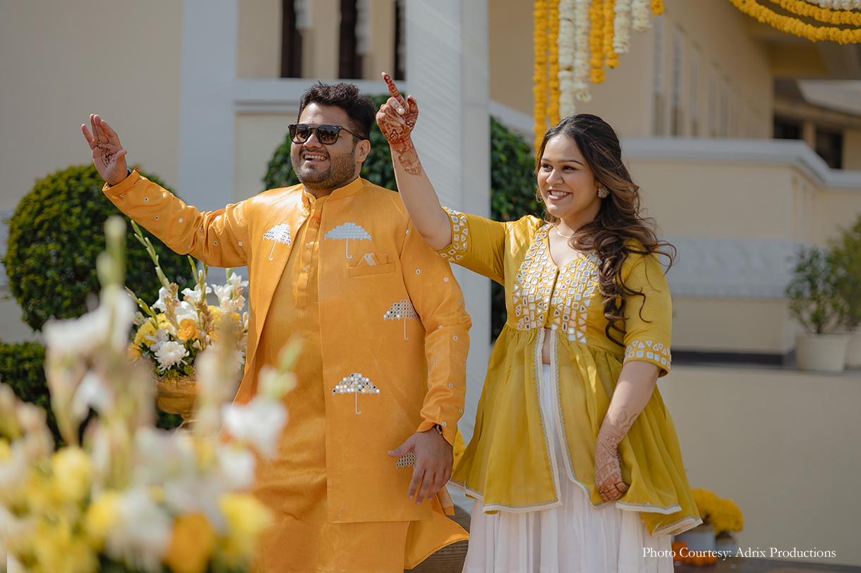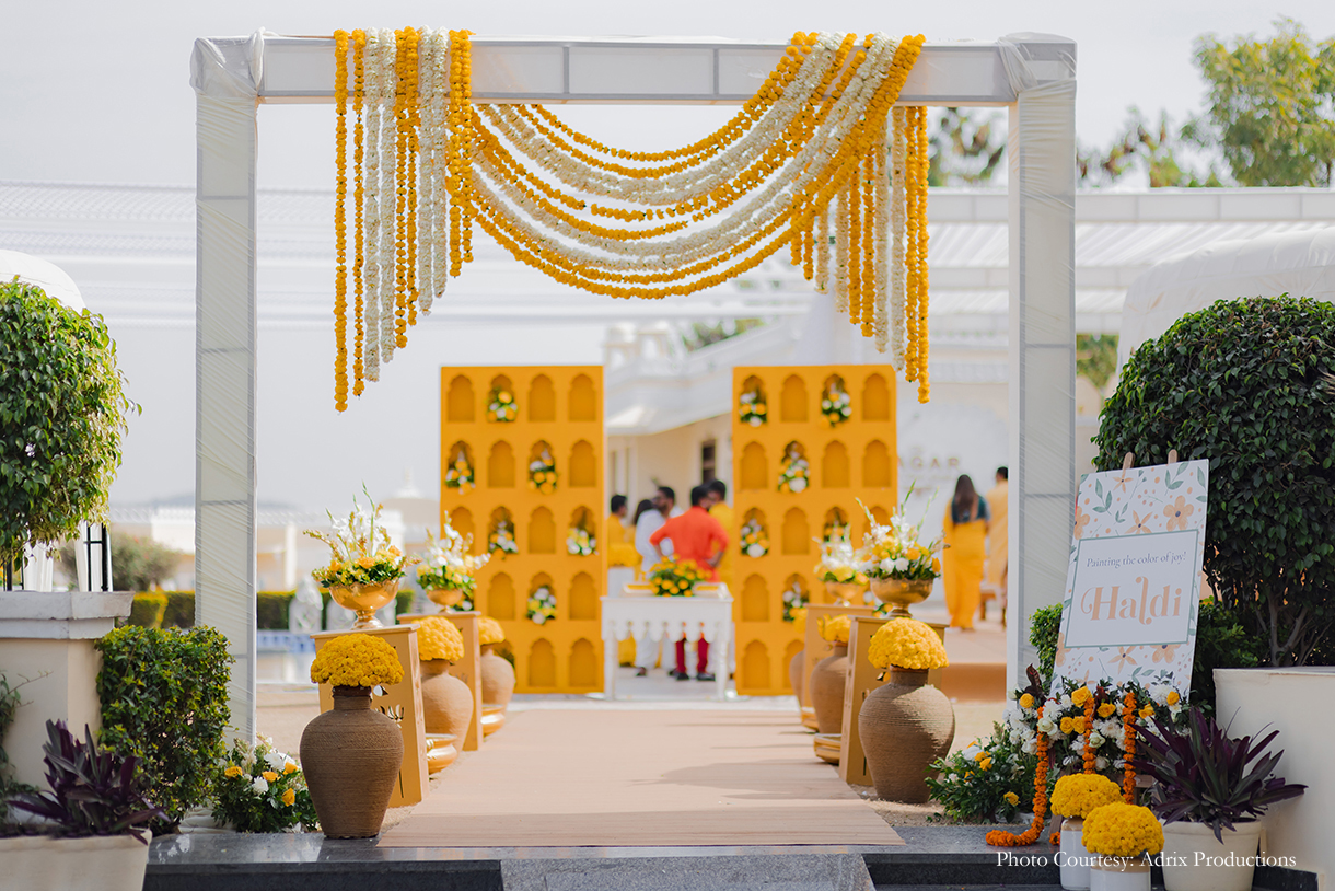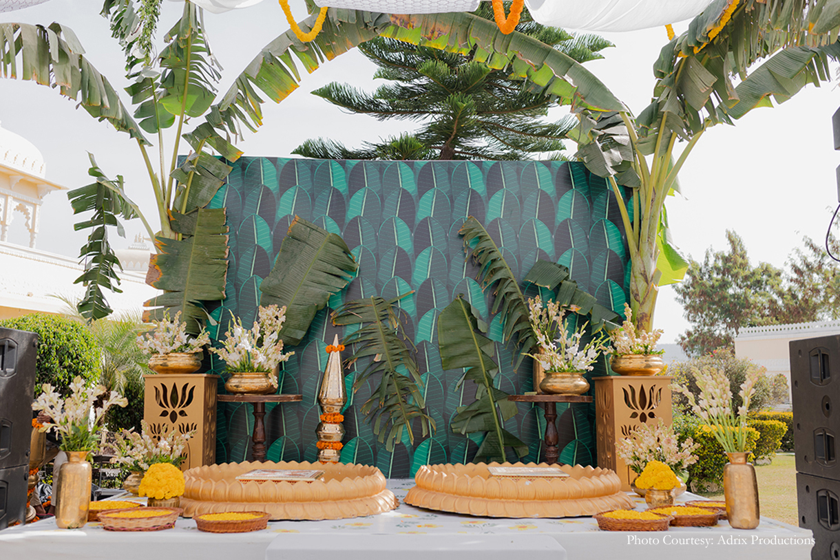 The Haldi ceremony saw a vibrant yellow and green theme, featuring banana leaves and marigolds. The couple’s special entry, accompanied by colorful smoke, symbolized their vibrant life ahead.