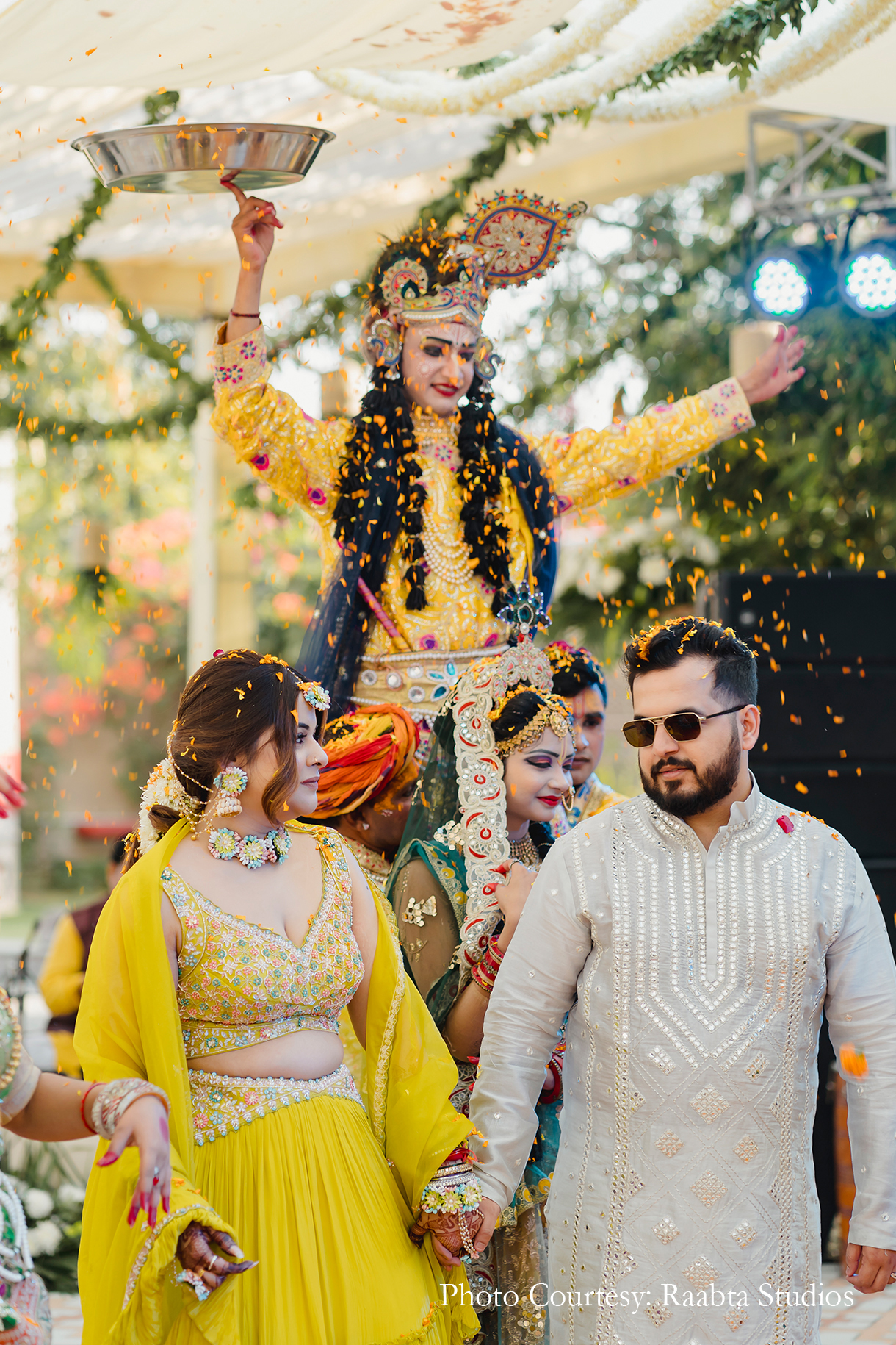 The poolside haldi saw a mesmerizing confluence of Radha-Krishna-themed decor, performers, and more that left everyone in awe. Baskets brimming with white flowers decked the space while a canopy of breezy drapes and flowers hung overhead.