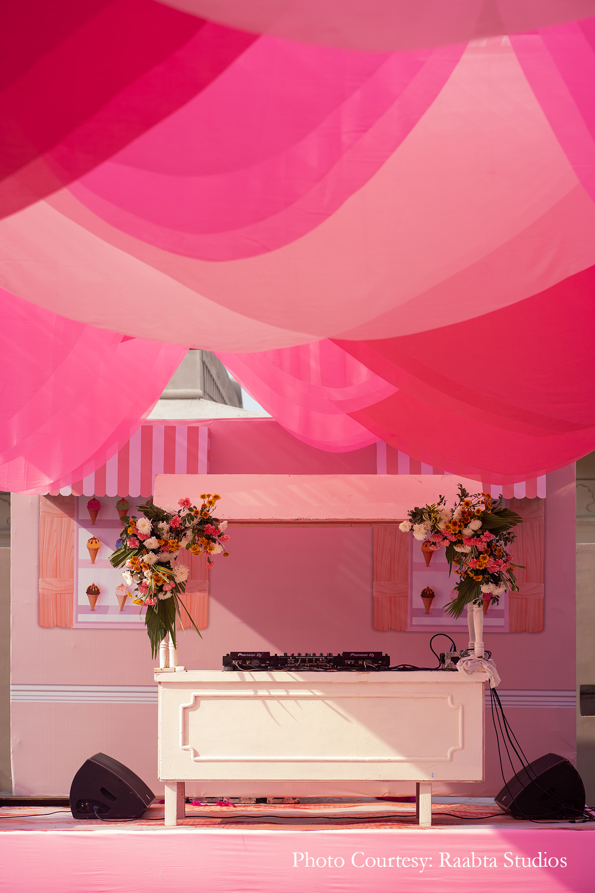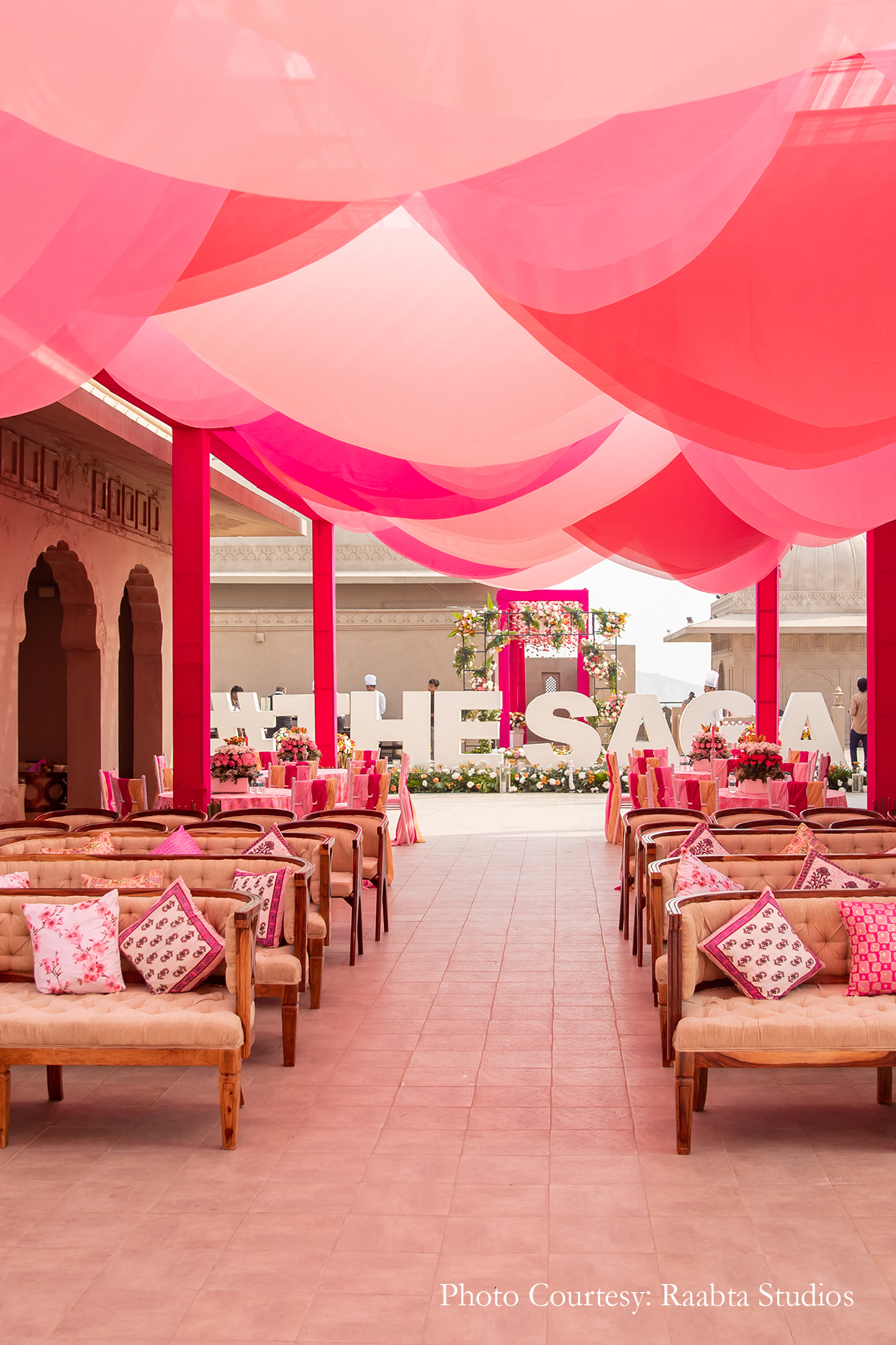 Starting with a welcome lunch for a meet and greet with all their guests, the couple hosted a lively, fun-filled mehndi soiree. Decked in charming hues of pink, the decor of drapes, cushions, and flowers lit up the outdoor venue.