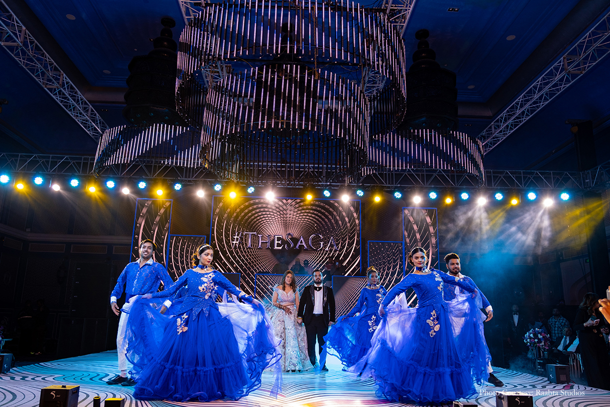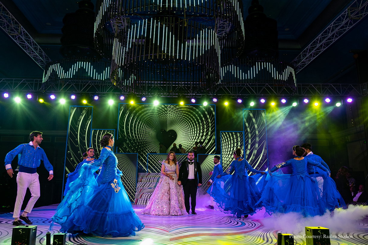 Kicking the tempo up a notch, the Sangeet saw a mix of glitzy decor and rousing entertainment for glorious revelries. Lights and floral arrangements in rich jewel tones set a decadent ambiance, while optical illusion-inspired prints, an island stage, and a bar added an avant-garde feel to the night. Dressed in a whimsical blue couture lehenga and tuxedo respectively, the bride and groom arrived with a dazzling entourage of professional dancers.