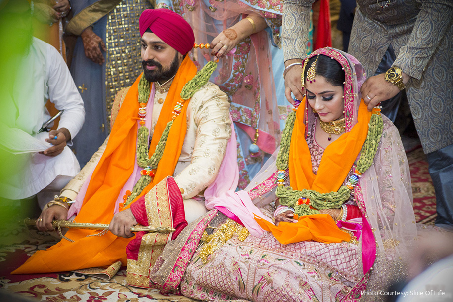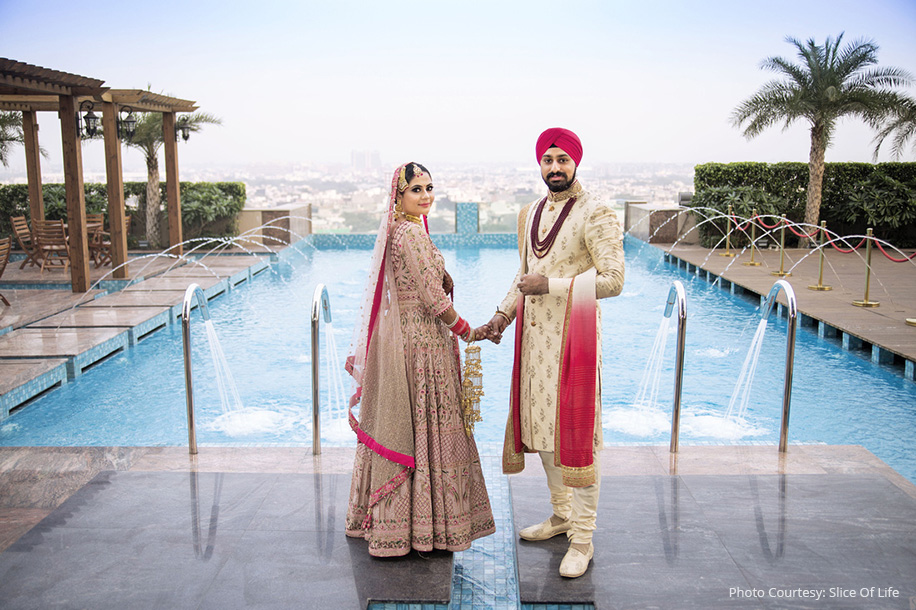 “We got married as per the Sikh rituals. The day began with my entry under a beautiful ‘phoolon ki chadar’ (floral canopy) into the banquet hall of the Seven Seas Hotel. I wore a peach outfit by Bani Batra that featured work using threads in the shades of pink and golden. Our names were embroidered on it, which I thought, was an interesting detail and made the ensemble a little more personal. Gurjot opted for cream sherwani from Stitch by Sarab Khanijou which he paired with an ombre pink dupatta. The pink and white colors of the decor also matched what we wore. Floral chandeliers and the gorgeous main entrance were some of the highlights of the setup.”