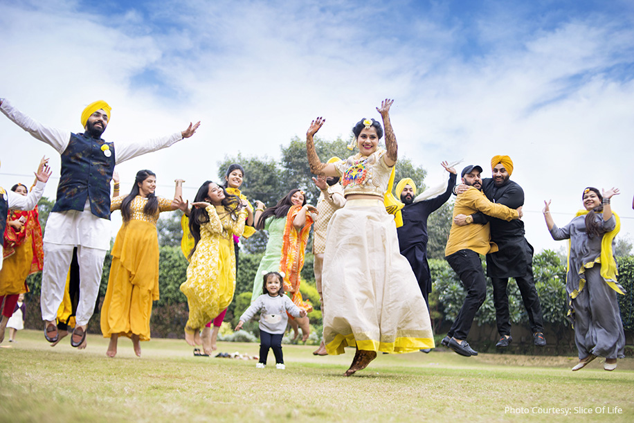 “We had our mehndi the following morning, and yellow was the dominant color for the decor of this event. Even our guests wore something yellow – be it their dupattas, turbans, or all-yellow ensembles. We even gave all my relatives badges such as ‘Bubbly Chachi’ and ‘Sexy Mami.’ The ‘Dulhan ki Toli’ tag was for all my bridesmaids. Colorful umbrellas dotted the venue, and ‘matkis’ (earthen pots) added ethnic appeal to the environs. All the women wore gota jewellery, and as the bride, I opted for floral bling. For this function, I wore a lehenga from Param Sahib Clothing. Gurjot and his family were not a part of this function because, in our family, the bride and the groom do not see each other a day before the wedding. However, he called my cousin via FaceTime and asked him to put me on the call. I didn’t expect this to happen and even though it was a tiny gesture, it just made the occasion so much more special for me.”