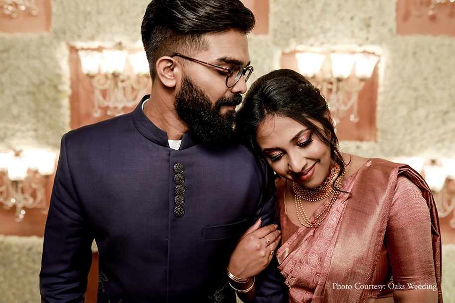 The couple were keen on an intimate reception with their relatives, friends and colleagues. Since they had covered the bride’s side of the culture with a white wedding, they wanted the finale in traditional Tamil style. Saira picked a beautiful Kanjivaram saree in a mauve shade which perfectly synchronized with the theme that followed – a mauve, grey and off-white color palette. Josh looked handsome as he complimented his ladylove in a custom-made indigo blue bandhgala by Gabanna Life.