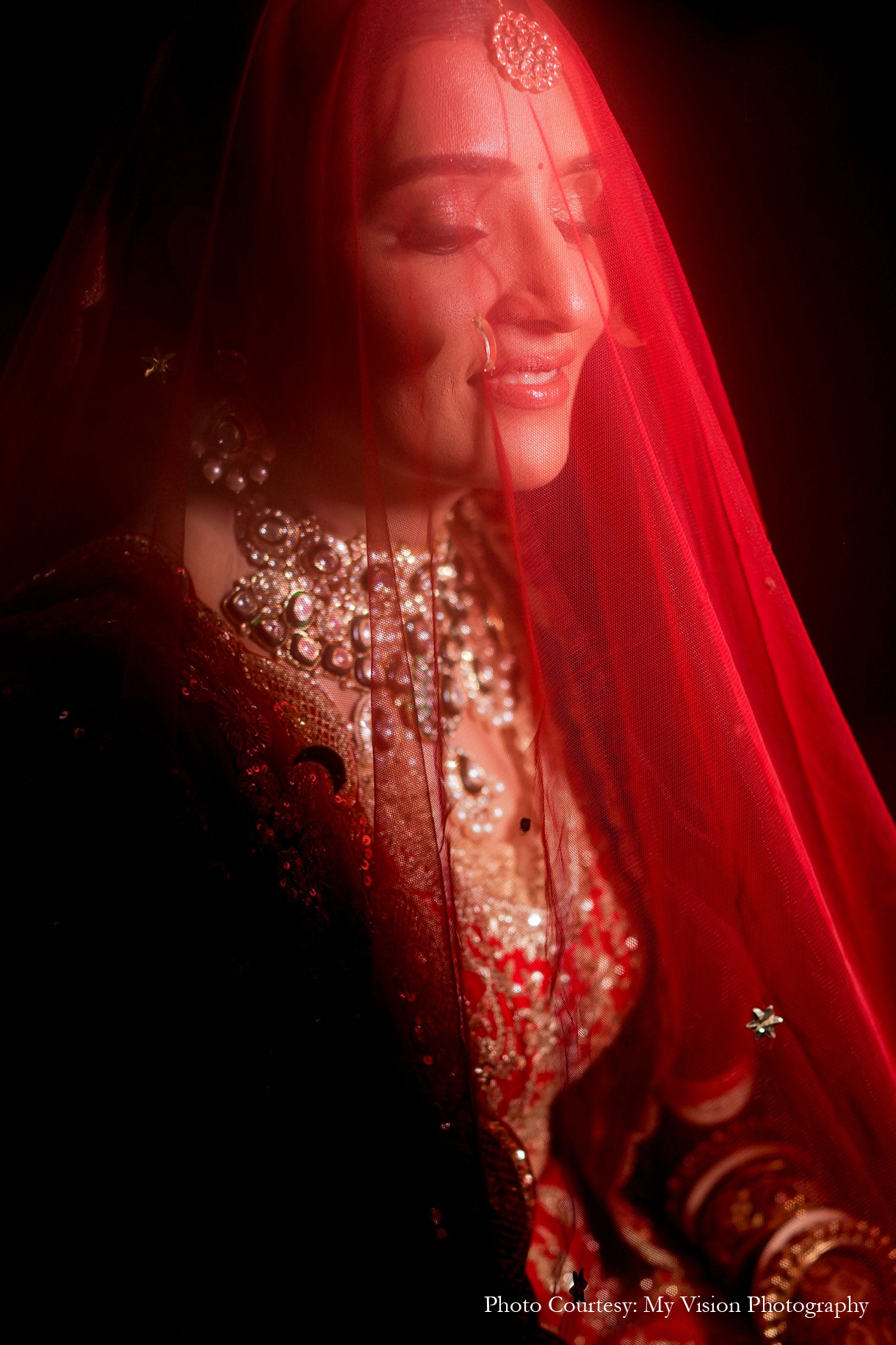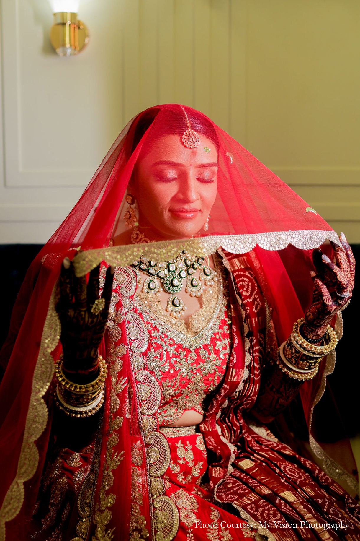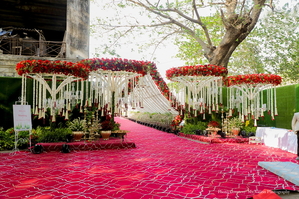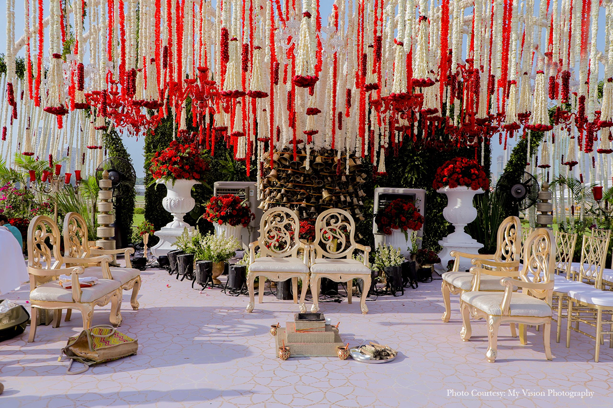 Nikhil adds, “The stunning wedding phere mandap stage was customized with the vintage bells and roots décor exuded timeless elegance, a symphony of red and gold.”