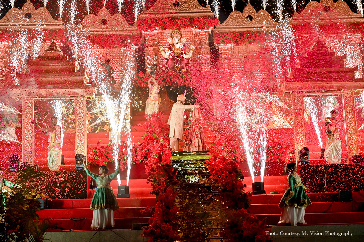 The couple exchanged garlands at the “Banaras Ghat”, even as a backdrop of SFX cold pyros, flame machine, rose petal showers and aerial fireworks enveloped them in a glow of enchantment.