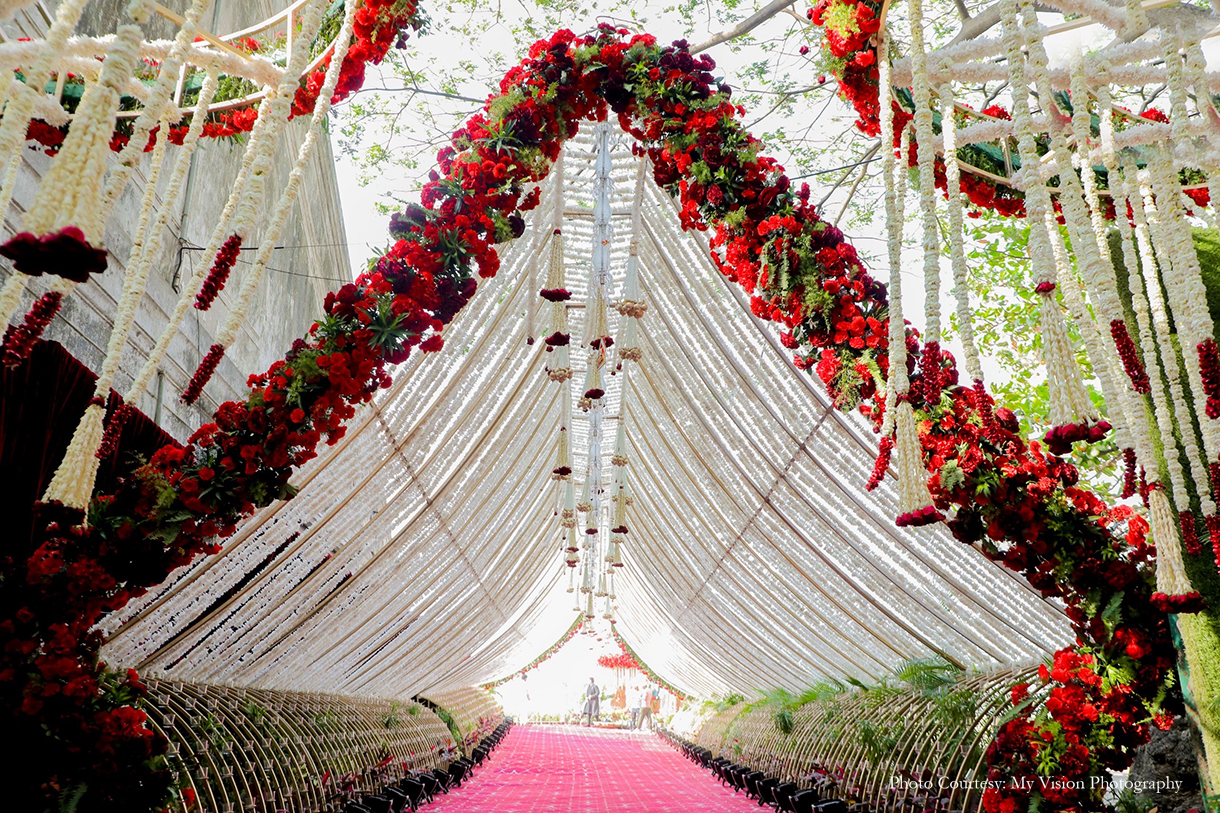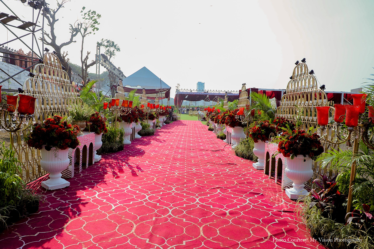 Nikhil Murarka of Centre Point Events says, “For the Varmala, a scene of seven temples were created on the steps at the venue. A team of 40 plus dancers and 12 priests were positioned across the steps for the ‘Ganga Aarti’.”