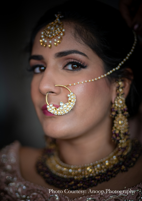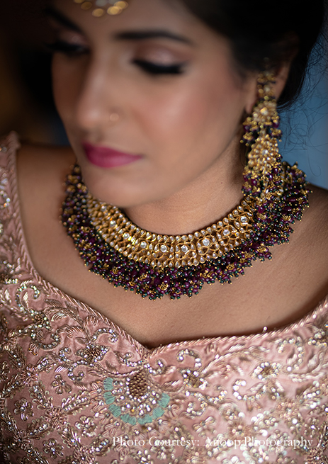 The couple had a traditional Sikh wedding (Anand Karaj). The bride and groom looked absolutely stunning on their special day. Sam glowed with glitter eyes and a rosy lip makeover done by WeddingSutra Favorite – Makeovers by Sejal. She wore a gorgeous pastel pink lehenga with pretty embroidered mint-colored flowers delicately set into the outfit from Jaamawar Minx by Rupam Grewal which she paired with shiny gold juttis. The venue had soothing decor with floral prints and pastel colors in the shades of pink.