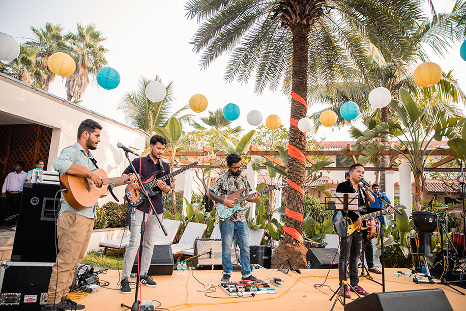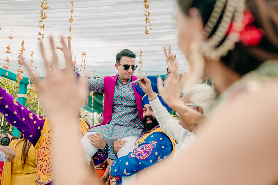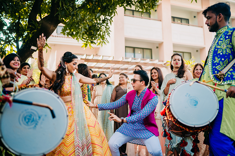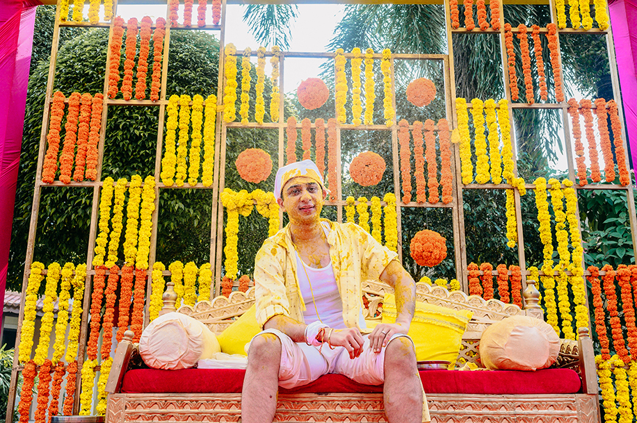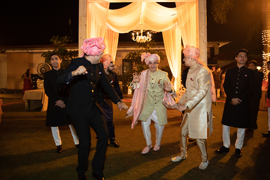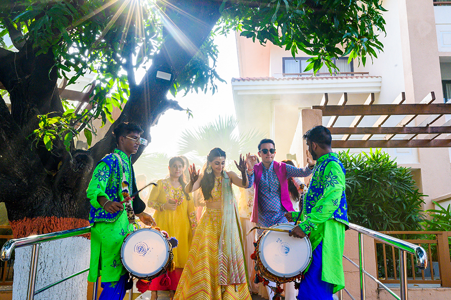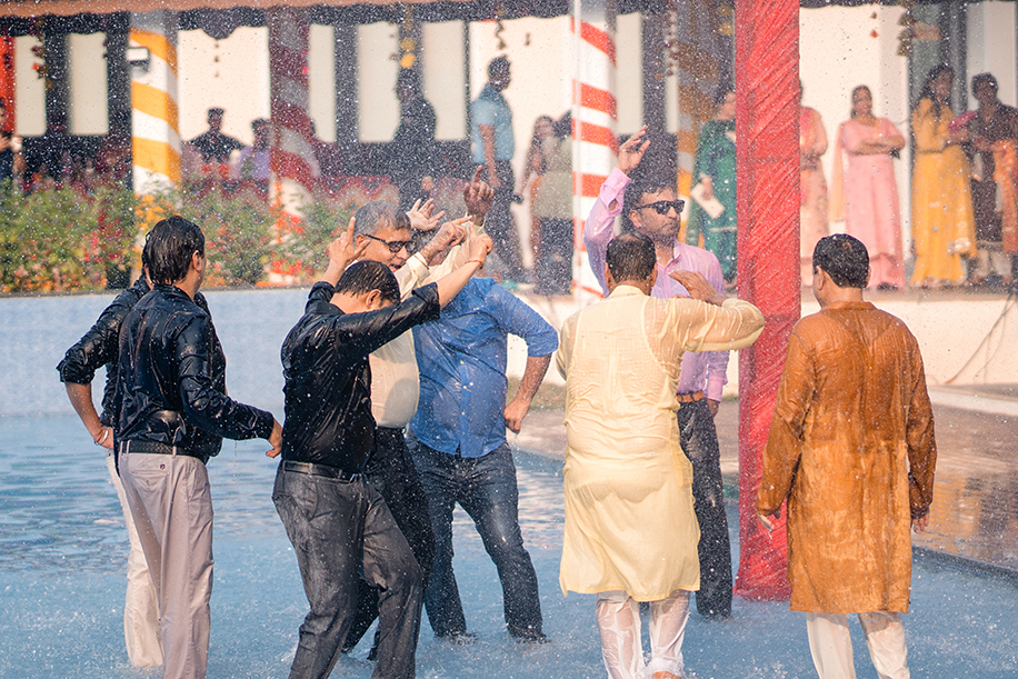 Eschewing a conventional haldi with a phoolon ki holi, the couple took a more fun approach to this event with a rain dance party! After the haldi rituals were done, the guests along with the to-be-weds had a gala time dancing to the tunes of a live band under the showering rains.