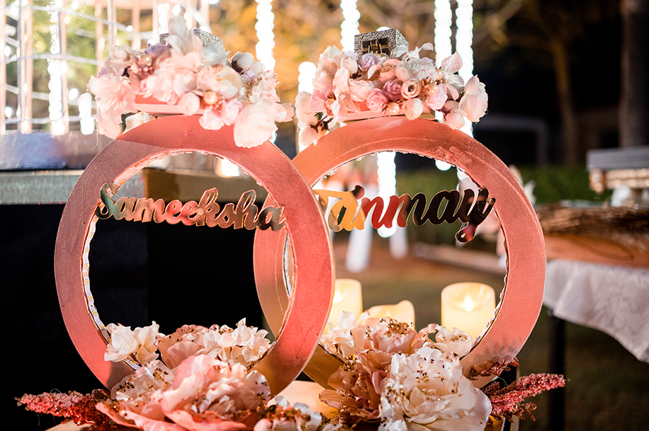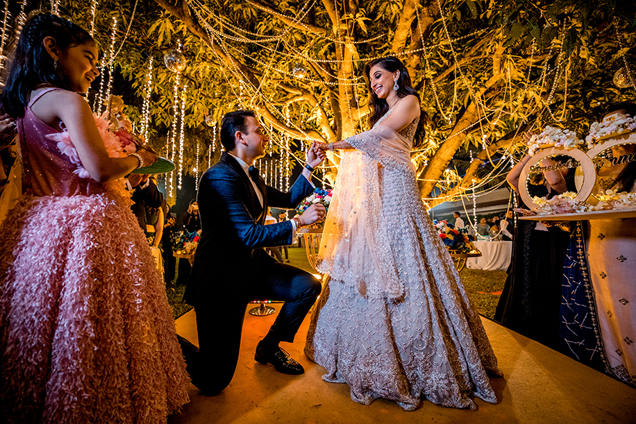 As evening fell, the glamour quotient was amped up a notch for the engagement and sangeet where the couple entered with the lighting of cold pyros. Fairylights gave the outdoor venue a golden glow and red roses added a dash of opulence. As the ring exchange ceremony took place, Tanmay went down on a knee to propose to Sameeksha all over again!