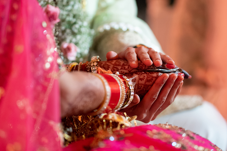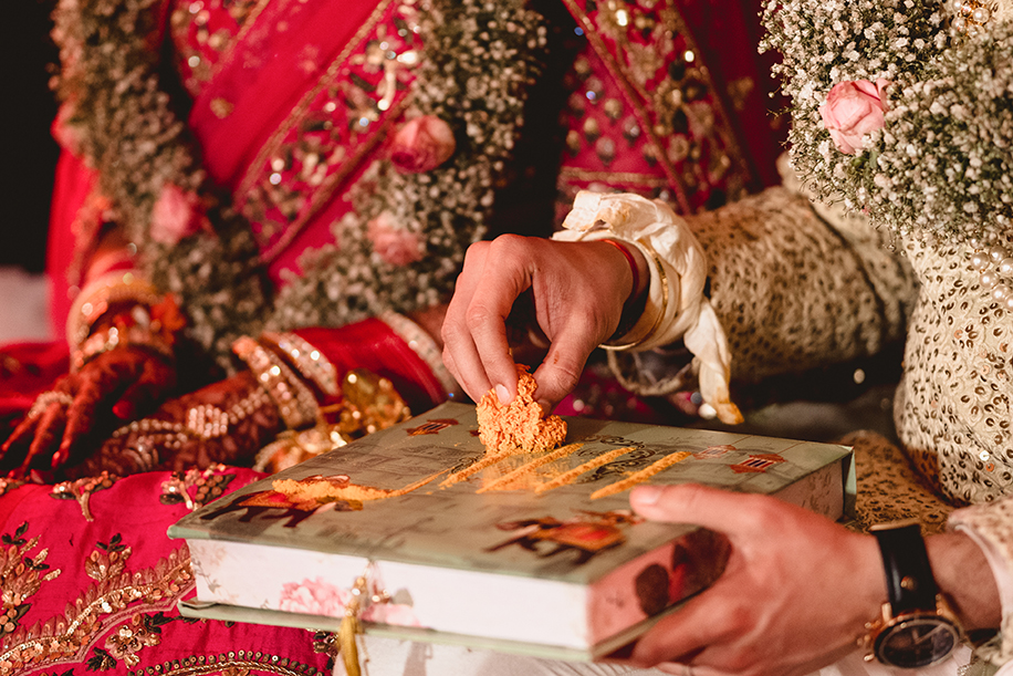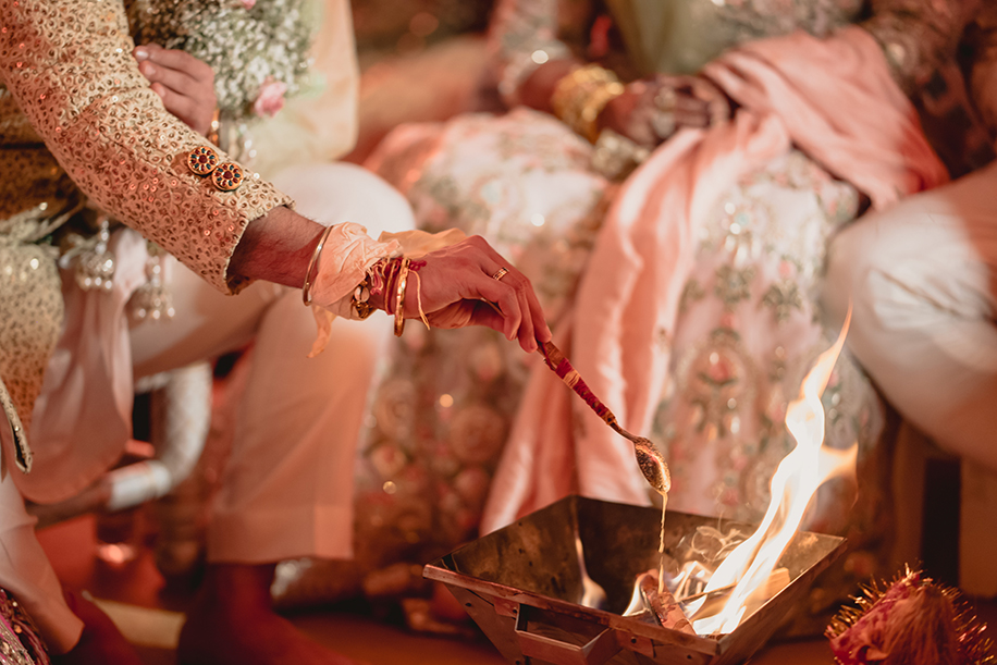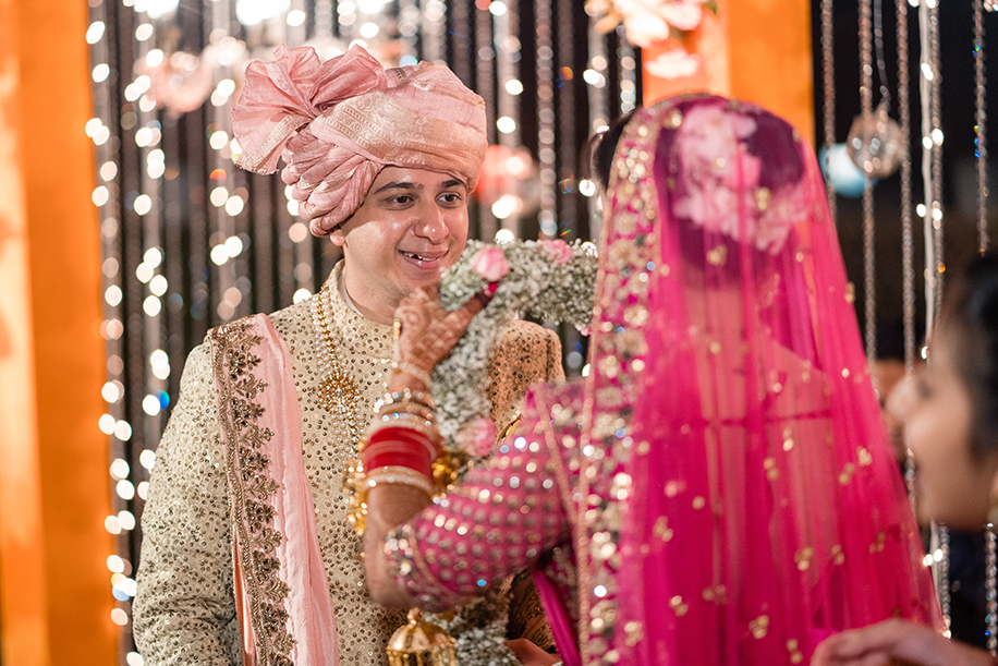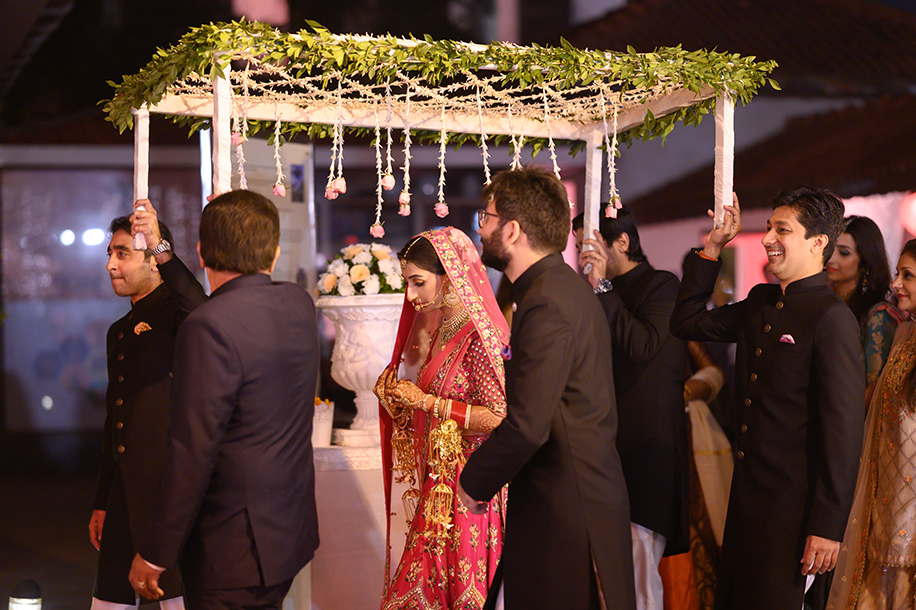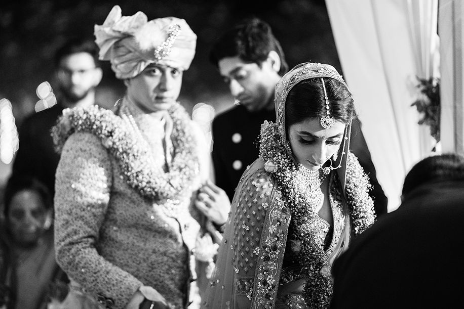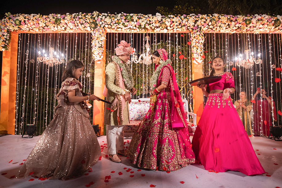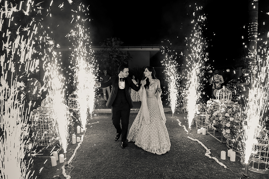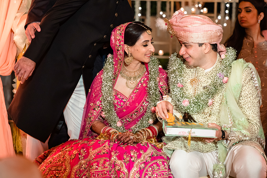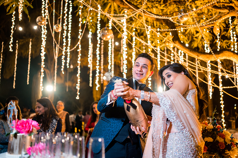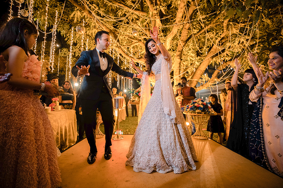 Keeping the couple’s minimalistic tastes in mind, the wedding was a close-knit affair with a peach-hued mandap bedecked with pastel blooms. An entryway lined by ornate white floral vases welcomed the guests and led them to the mandap. Strings of fairylights were suspended from tree branches creating a magical ambience.