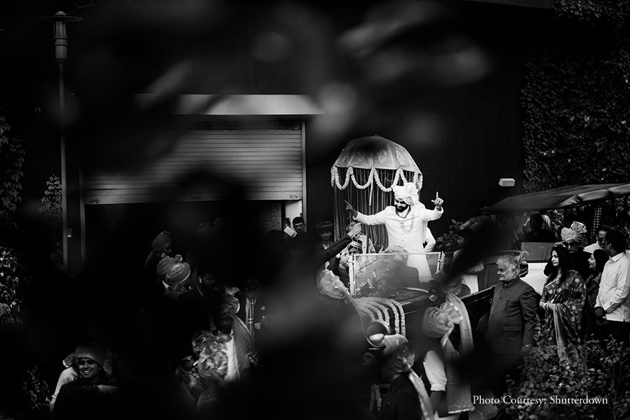 Samiksha exuded old world charm in her finely embroidered lehenga with floral patterns and a red dupatta over her head. Her jewellery, however, was the showstopper with its intricate kundan work on a mint green background which gave her a truly regal look. Inspired by his bride, Utsav also chose to go the royal way with a white embroidered sherwani which he paired with a tiered ruby necklace to add a splash of color. The decor added plenty of cheer to the ceremony with its floral theme and quirky lighting. Samiksha made a stunning entry to the tunes of a ‘sringa,’ while Utsav opted for a vintage car and grooved to the beats of the dhol.