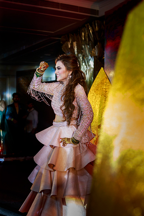 Brimming with bright, quirky elements such as teepees, masks, flowers and a whole lot of colors, the vibrant Pool Party was the perfect way to kick start the festivities. Dressed in periwinkle blue, the groom left everyone awestruck arriving on a jet ski, while smoke bombs, fun games and a rain dance added onto the fun. The bride channeled youthful charm in a ruffled and embellished white and blue number by Papa Don’t Preach by Shubhika.