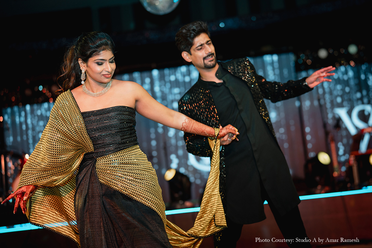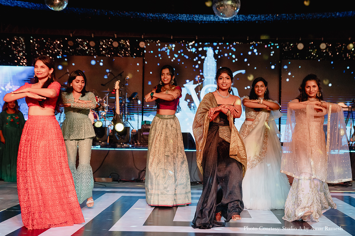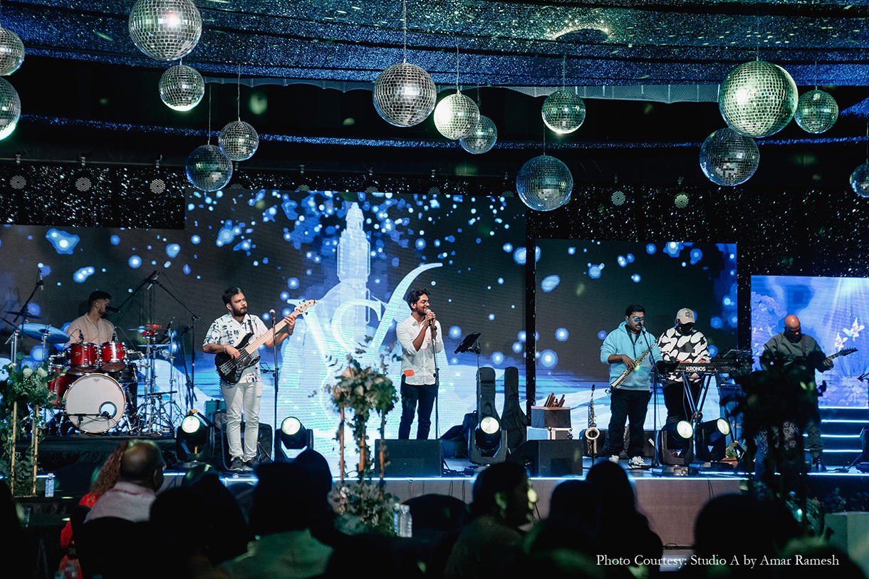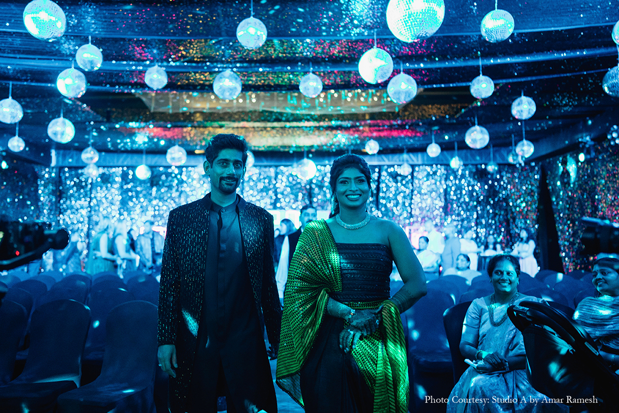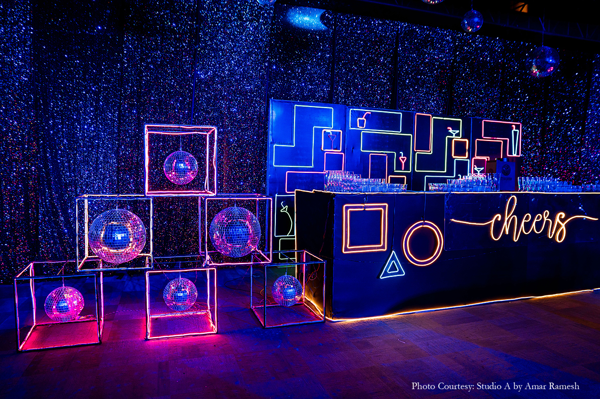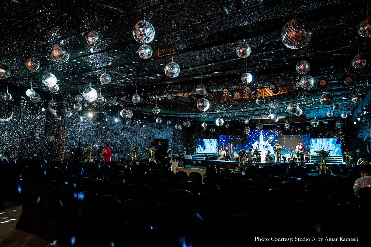 Imagined with the theme of “Interstellar”, the Sangeet function, with its edgy, dark decor and exuberant revelries, was quite literally out of this world! The couple dressed in chic ensembles of black and gold to match the mood as they took to the stage with their loved ones and danced the night away under a canopy of glittering lights and disco balls.