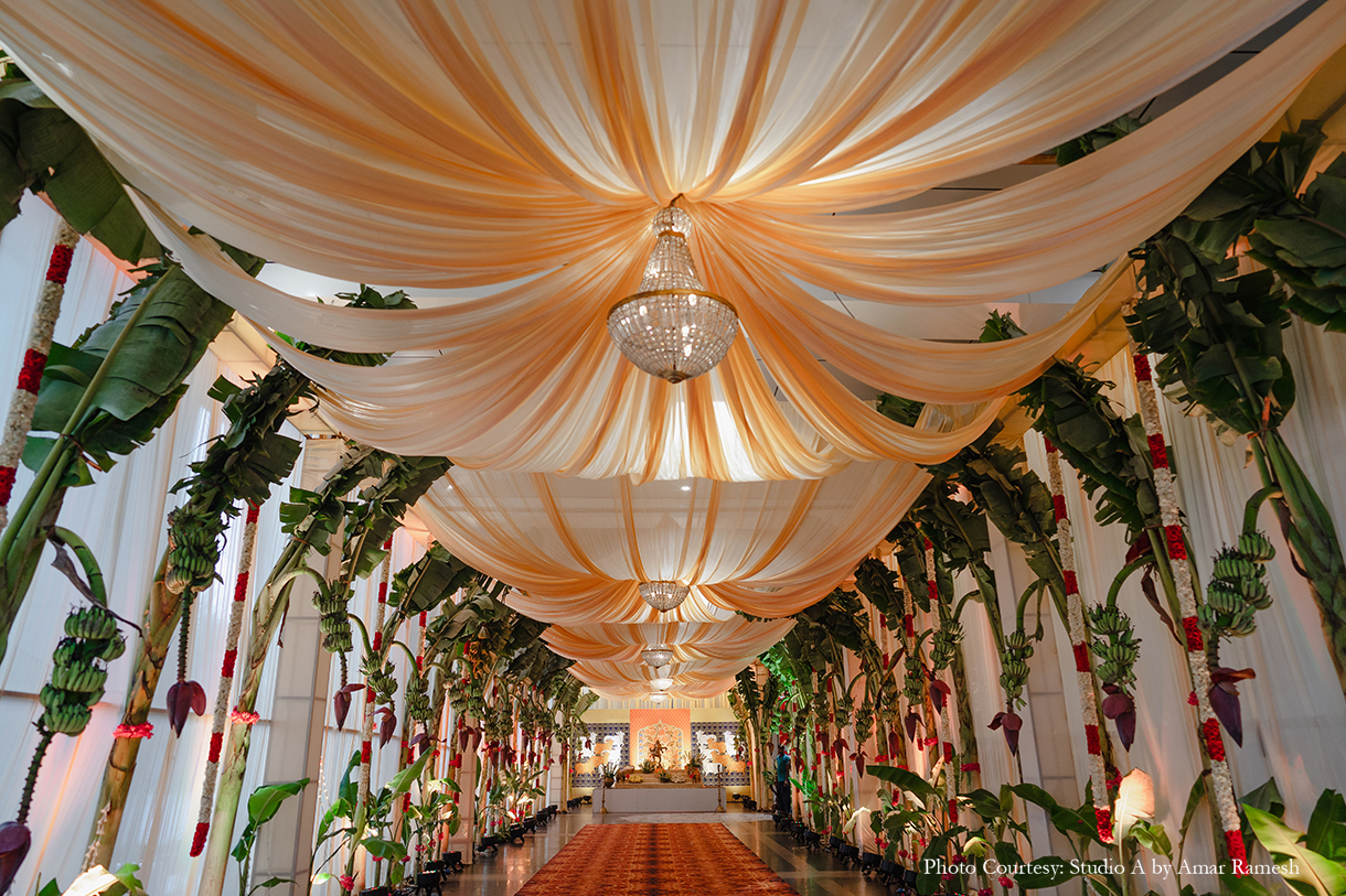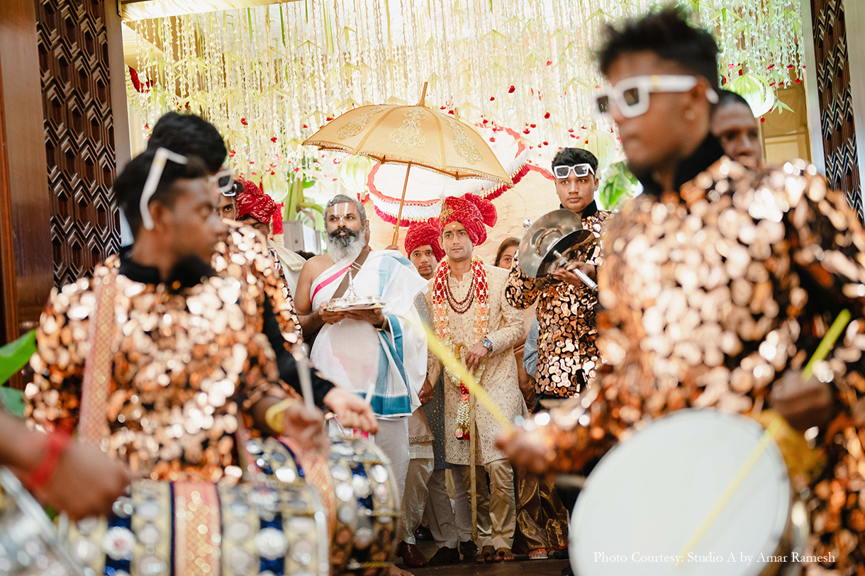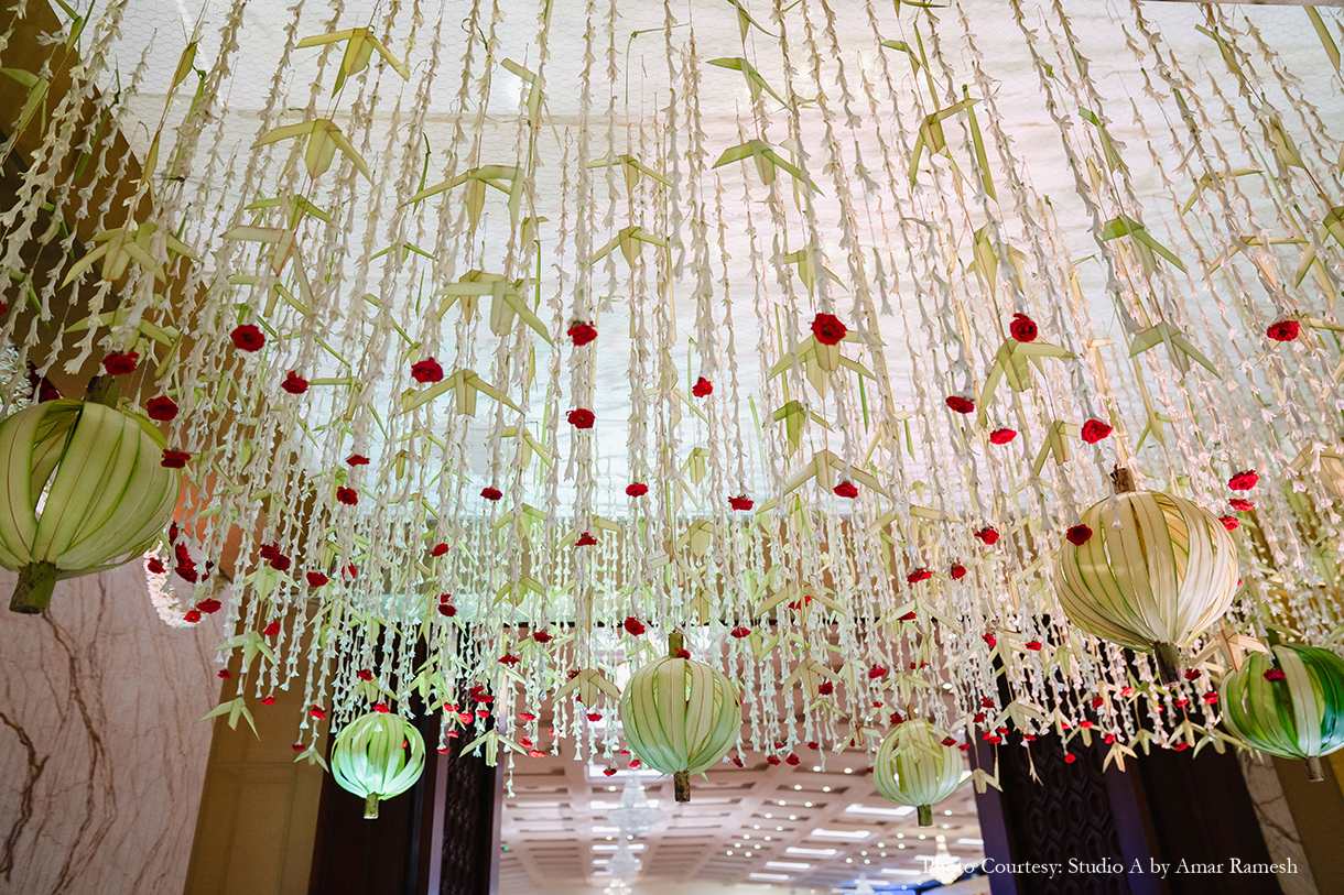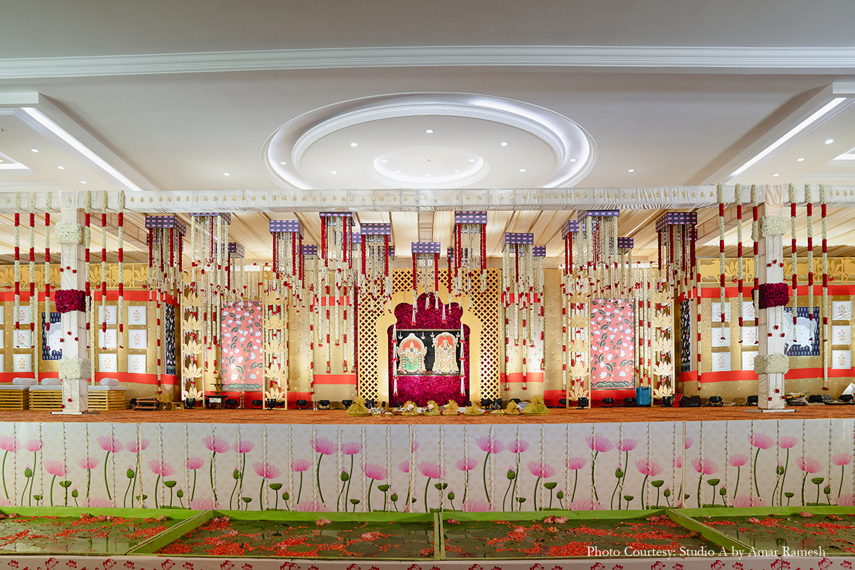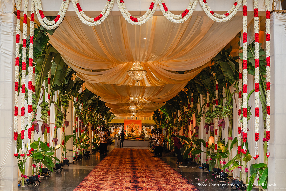 Hosted at the illustrious RK Convention Centre in Chennai, the wedding ceremony awed all with its traditional grandeur. The stunning mandap of white and red was adorned with an abundance of local flowers and foliage, majestic portraits and sculptures of deities, and other sacred elements, setting an ambiance of tranquillity for the nuptials. Resplendent in garments of their respective cultures, the bride and groom tied the knot amidst great cheer.