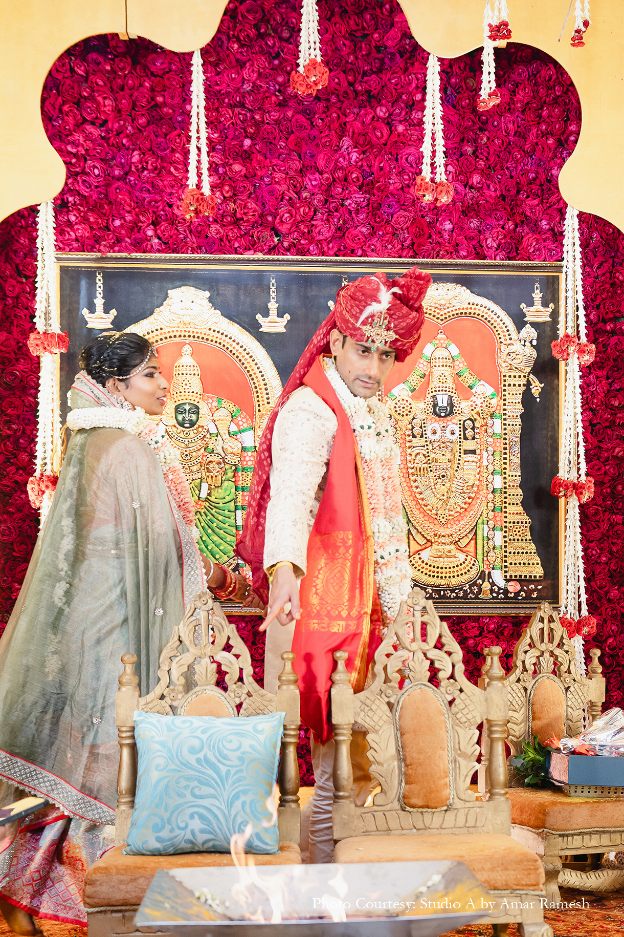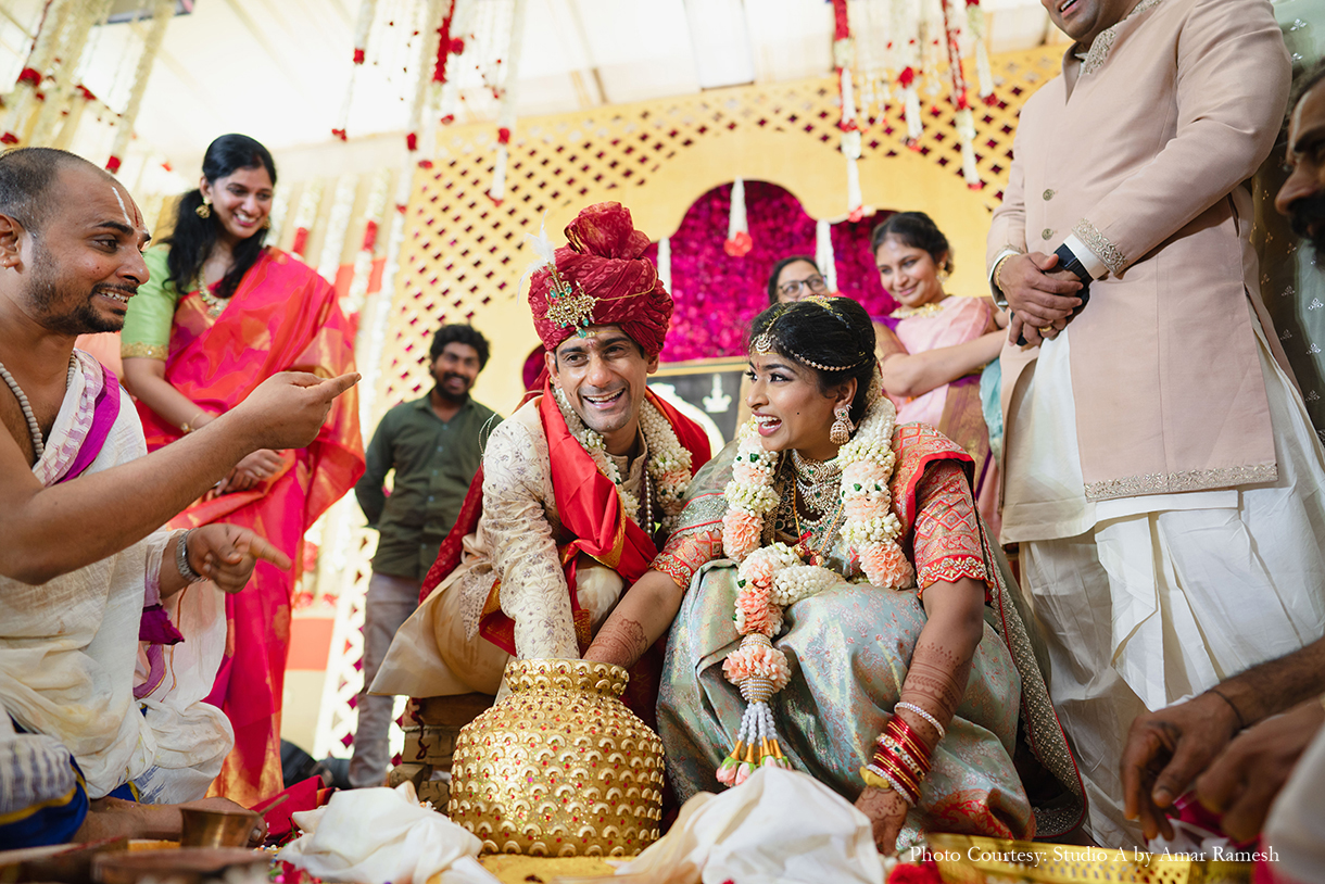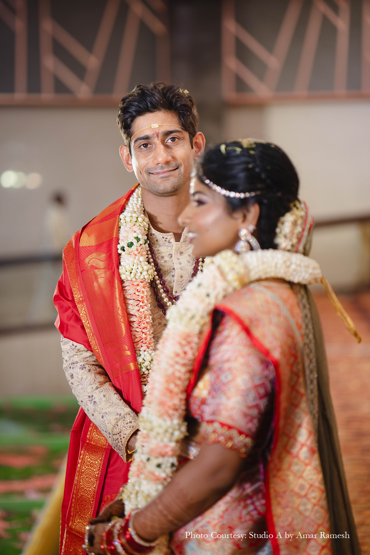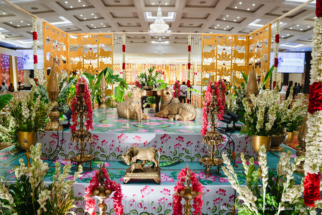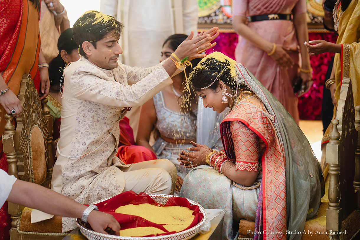 Hosted at the illustrious RK Convention Centre in Chennai, the wedding ceremony awed all with its traditional grandeur. The stunning mandap of white and red was adorned with an abundance of local flowers and foliage, majestic portraits and sculptures of deities, and other sacred elements, setting an ambiance of tranquillity for the nuptials. Resplendent in garments of their respective cultures, the bride and groom tied the knot amidst great cheer.