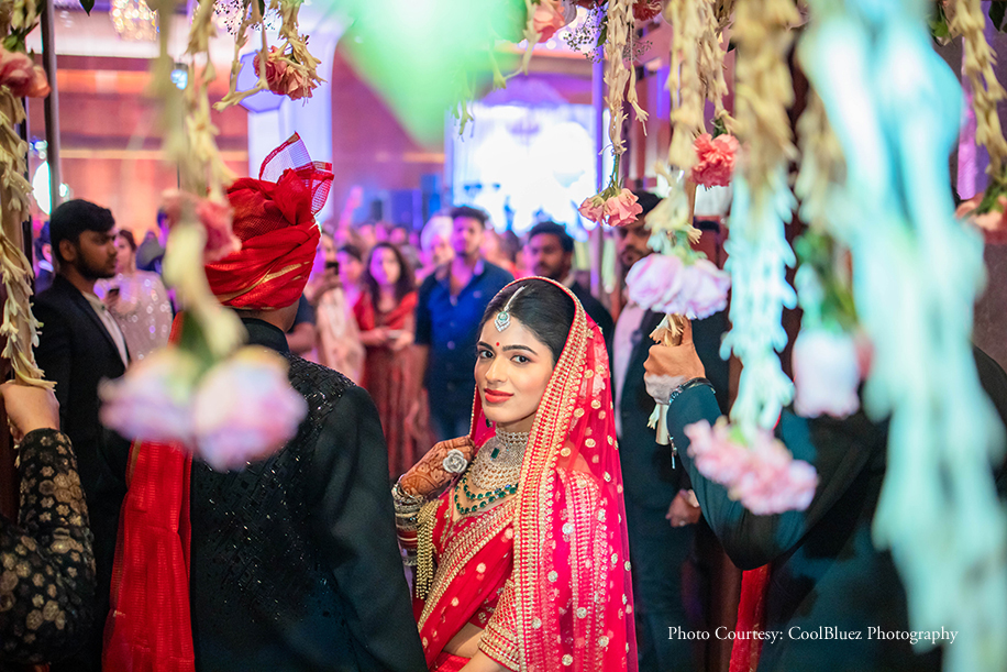 The bride wanted a very modern wedding with an all-white set up with hints of pink in it. The wedding had a very English vibe to it, with sophisticated and elegant decor for which the couple worked closely with the Ferns n Petals team for more than six months. Every detail was based on their sketches and the bride’s imagination. From the transparent chairs to the beautifully designed stage, and from the floral wreaths on the tables to the candle centrepieces, everything was designed and executed beautifully. The bride picked a traditional red Sabyasachi lehenga, and the groom added a magical contrast by opting for a pastel green Sabyasachi sherwani. Sanya also wore beautiful pieces of jewellery which had a lot of sentimental value as she entered into this new phase with a lot of blessings. She paired her bridal outfit with her paternal grandfather’s 65-year-old engagement ring, her mother-in-law’s wedding payals as a hair accessory and her mother’s wedding payal on her feet. She kept her makeup minimal by ditching foundation and added a little glam on her eyes and a pop of pink on her lips