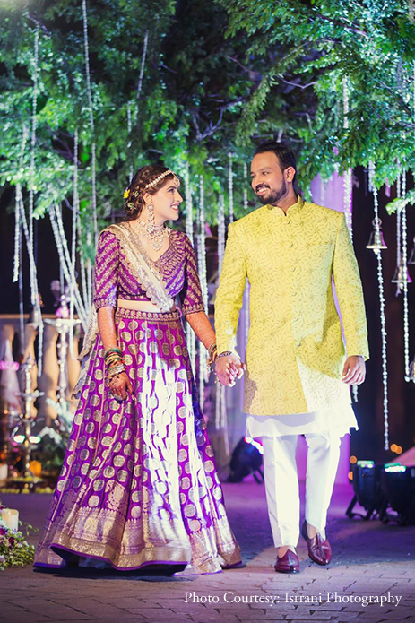 Post the dinner, all the baraatis geared up for an after-party full of dance, music and copious amounts of alcohol. DJ Taher and Saurabh with his team, had the party going strong with their upbeat music. The bride and the groom were welcomed by pyro shots as they made their entry wearing a purple and gold banarasi lehenga by Jayanti Reddy and a white kurta with a yellow bandhgala by Deepak Parwani respectively.