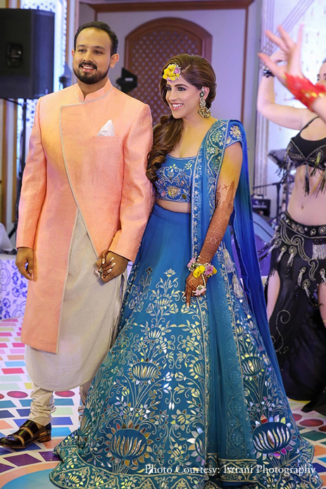 The afternoon saw the mehndi ceremony at the Garden view venue that featured mesmerising decor. DJ Taher had everybody grooving to his beats for this function. An illusionist, a Tanoura dancer and Belly dancers kept the guests entertained and perfectly tuned to the Arabic theme. The bride wearing a vibrant blue outfit by Asiana Couture and the groom in an asymmetrical blush pink indo-western sherwani were escorted by International dancers while Singer Aishwarya Bhandari gave a live performance.