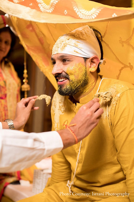 The bride and groom had separate haldi ceremonies where both of them were seen donning understated pastel yellow outfits. Post the function the groom’s squad sat down for a pooja and safa bandhai ceremony.