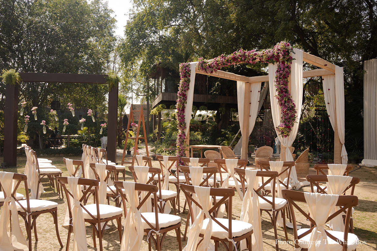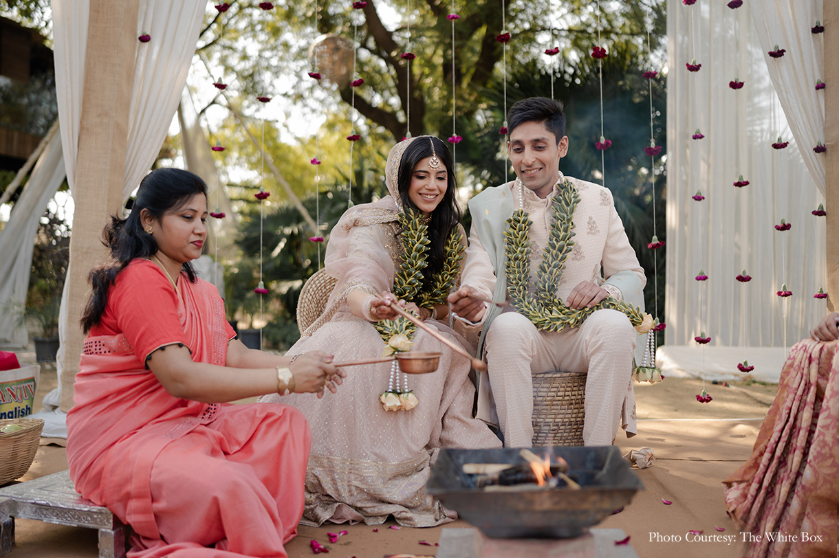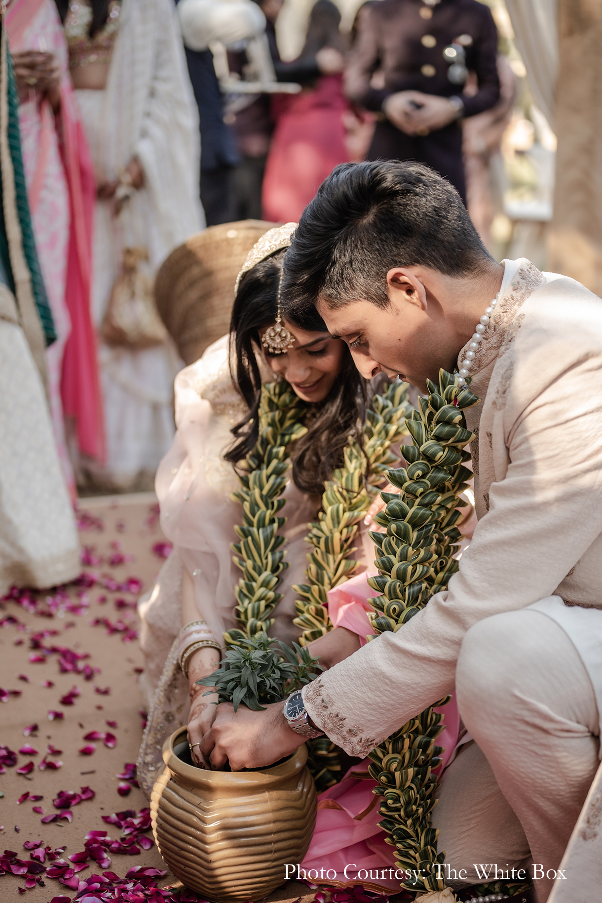 The romantic day wedding exuded “Sunday Brunch” vibes with lavender and dark pink flowers, flowing pastel drapes, and rattan furniture. The bride wore a pastel pink Rhea Kapoor lehenga while the groom matched her in a sherwani by Ashish Soni. They exchanged unique green varmalas made of leaves and were wed by a female priest in a heartfelt, empowering ceremony.
