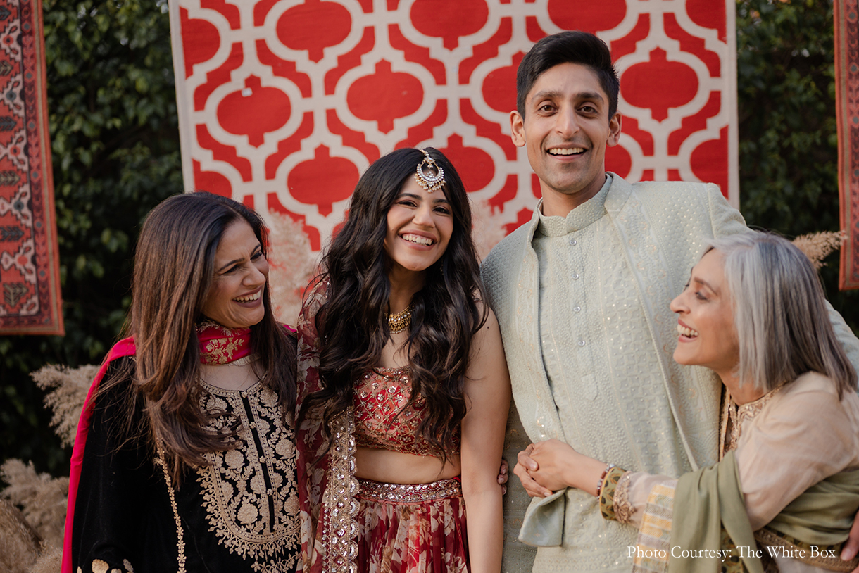 The festivities kicked off with a boho mehendi soiree followed by a cocktail night. The rustic decor was imagined in an earthy palette of deep reds and rust with pampas grass, wooden furniture, billowing drapes, hanging rugs, and more. Thoughtful messages were written on chalkboards on every corner to spread their message. The bride channeled a boho goddess in a floral red lehenga by Aastha Narang while the groom sported a pistachio green kurta-jacket set by Ashish Soni as they danced the night away with their friends and family.