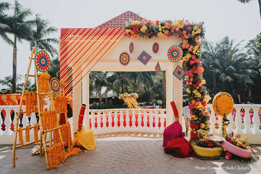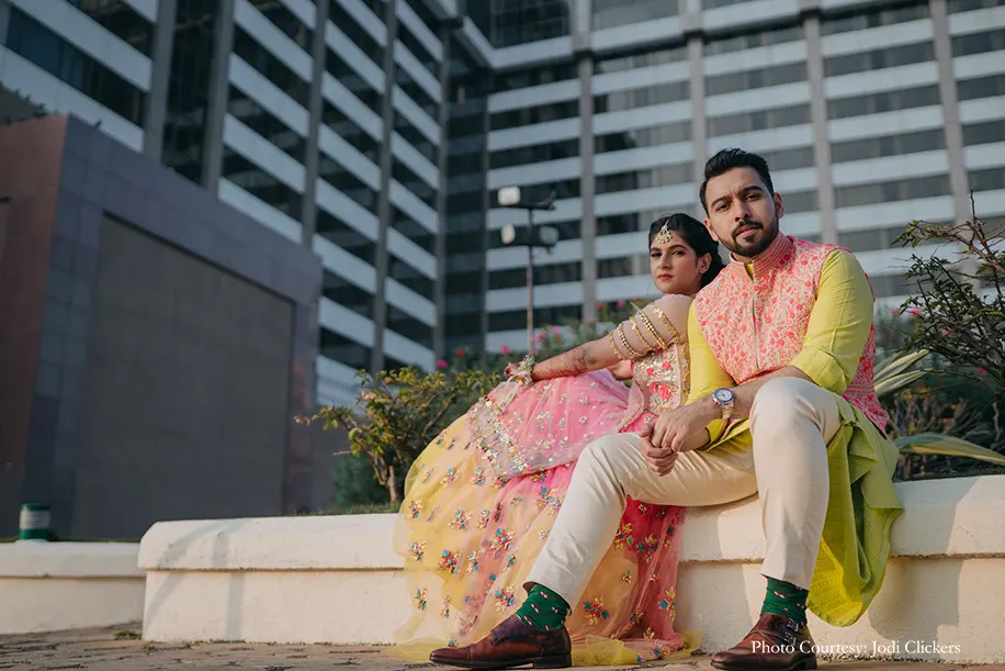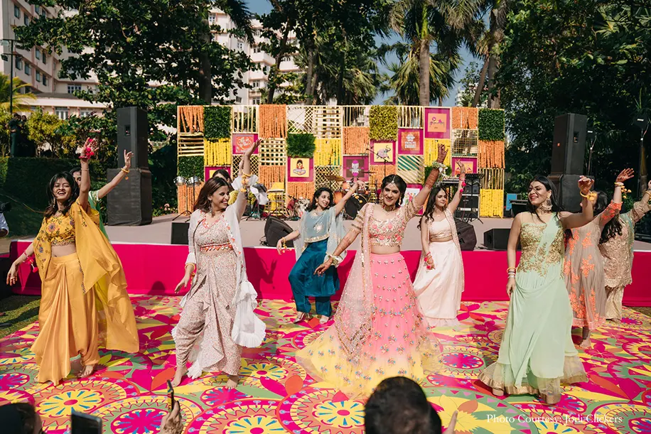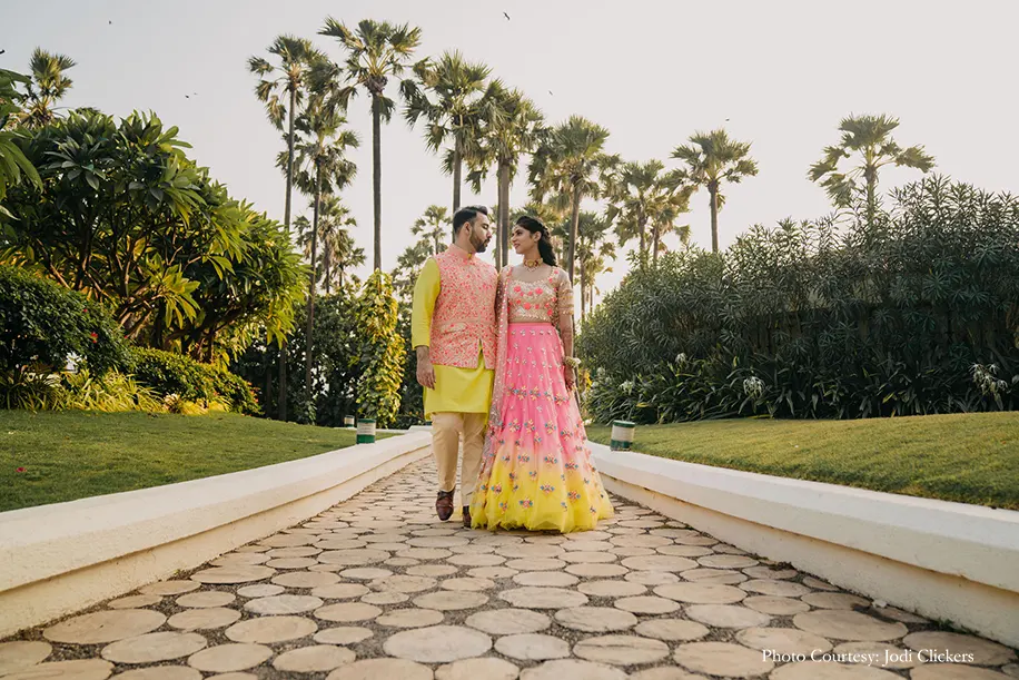 The festivities kicked off with a colorful mehndi celebration hosted in a lush outdoor venue. Vivid hues of orange, yellow and pink created a stunning contrast against the greenery, with quirky decor, flower arrangements, a snake and ladder dance floor and more. The guests were served special mocktails as they enjoyed the performances by the couple, their family and professional singer Aishwarya Bhandari.