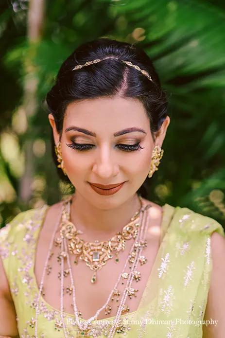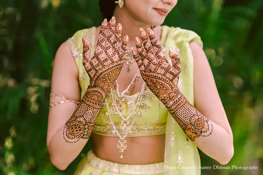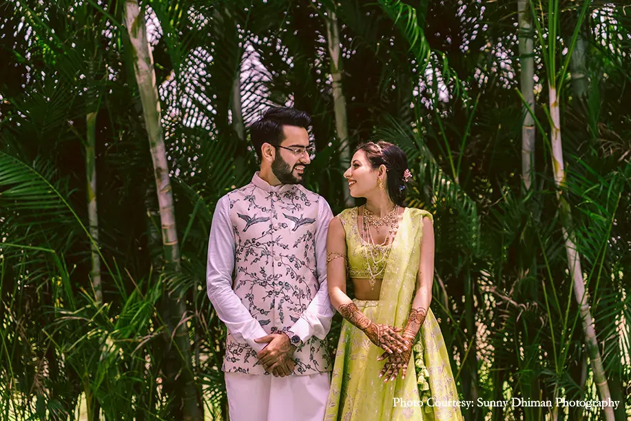 An extravaganza of color and quirky decor ruled the sunny Mehndi function hosted in the lush lawn space of the property. Eclectic elements like bohemian teepees, tassels, teapots and fans, wooden crates, flowers, brightly colored signs and carts of bangles greatly added to the electrifying vibe. The bride looked radiant in a lime-green lehenga, perfectly complementing the groom’s baby pink Bandi jacket and kurta set.