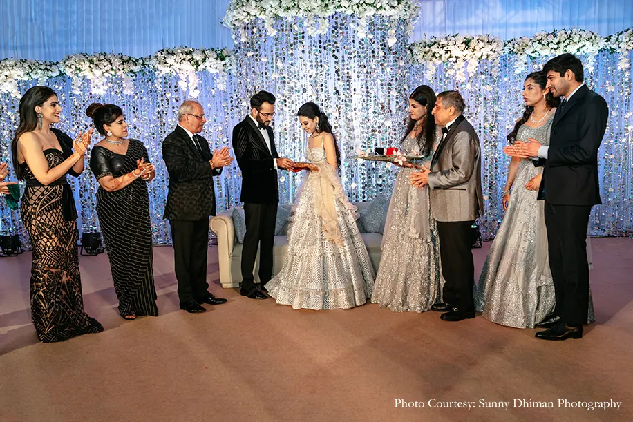 The Sangeet function was an elegant, glamorous affair with stunning light effects, photo op corners and a canopy of silver tinsel with an abundance of white flowers. The couple and their families looked resplendent in a dress code of silver and black for the evening that saw stellar performances, the ring exchange and more.