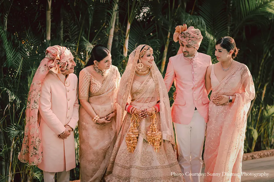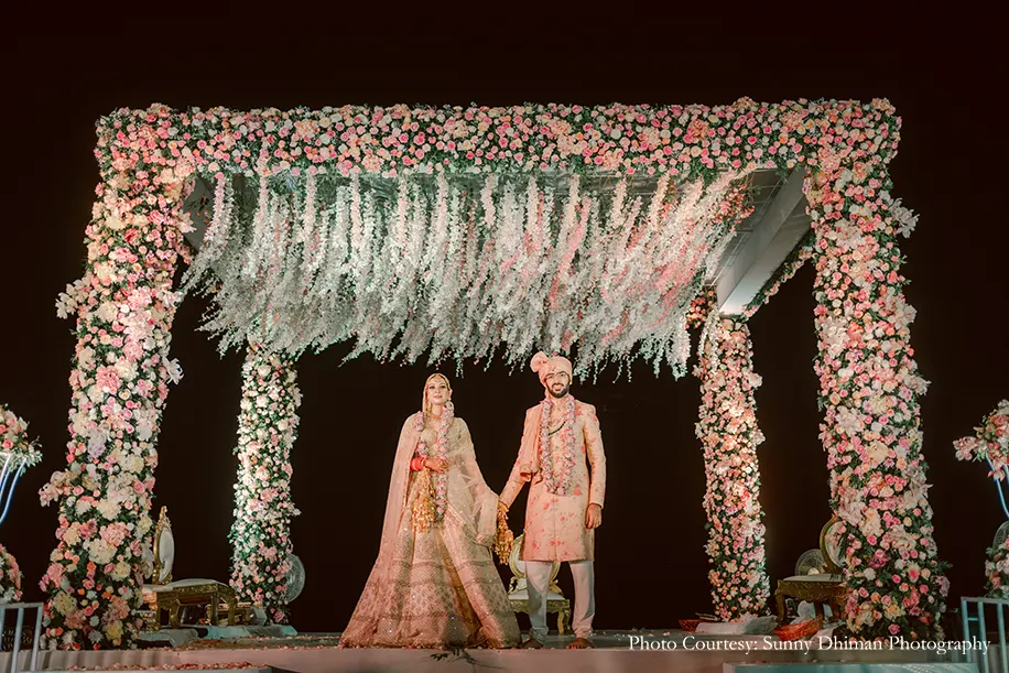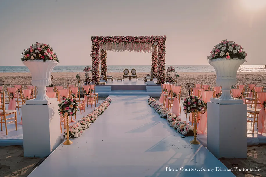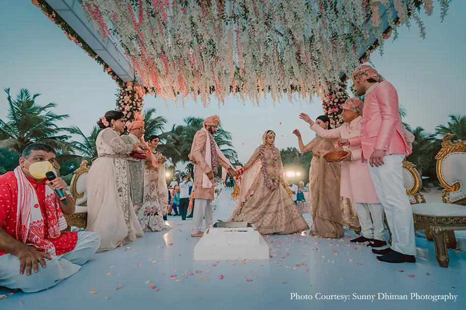 The tranquil beachfront wedding was a pastel-hued dream playing out against the shimmering blue waters. Shades of peach, pink and white covered the area leading to the mandap with a swaying canopy of flowers that hung above the couple as they tied the knot. Wearing shades matching the decor, the couple and their families painted a pretty picture.