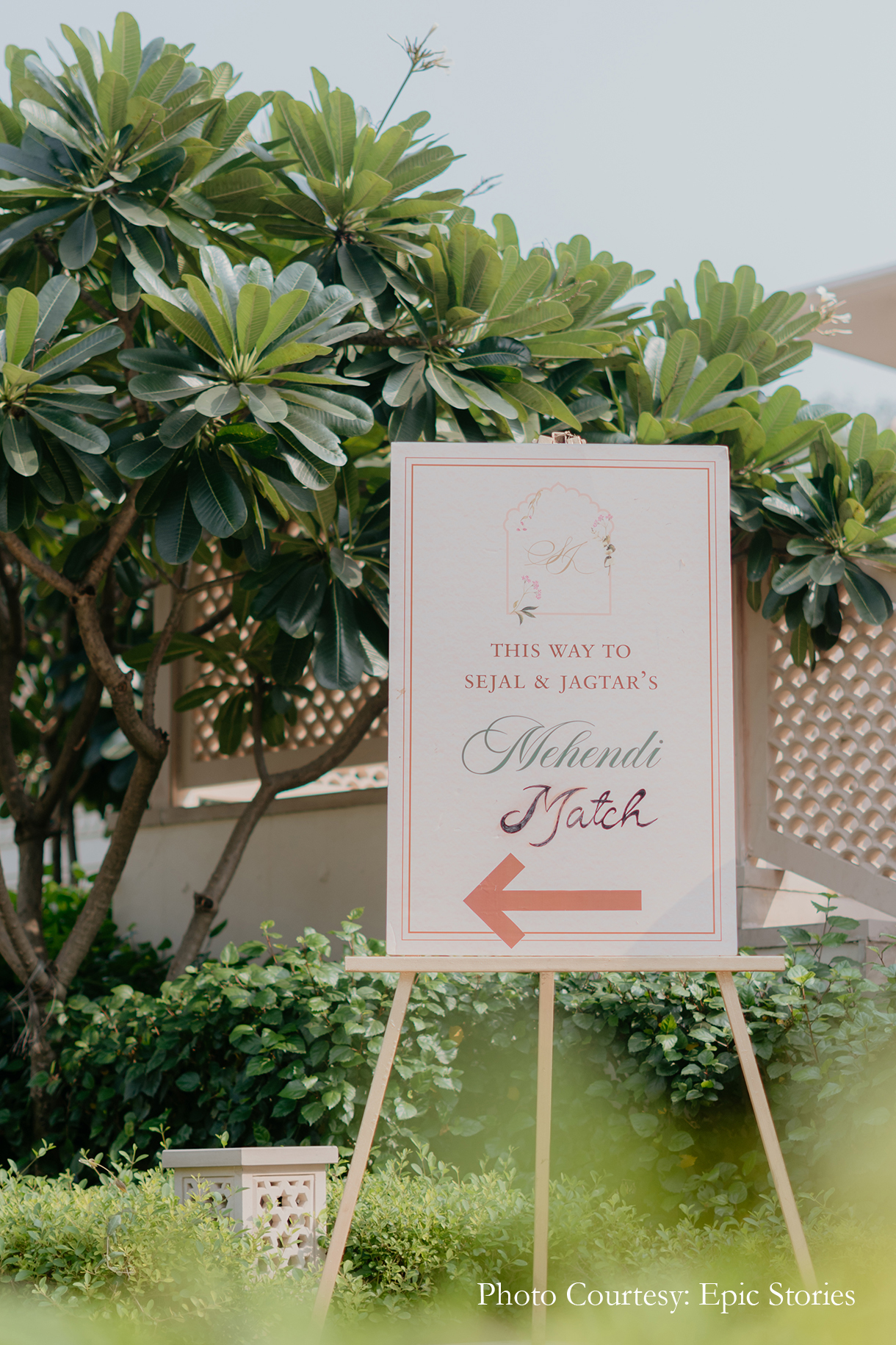 This soiree combined the spirit of a traditional Indian Mehndi with the charm of an English garden party, reflecting both Sejal and Jagtar’s cultural backgrounds. Guests enjoyed a fusion menu curated by Chef Saurabh at The Oberoi, featuring delights such as scones, tea, Amritsari fish and chips, pani puri, and samosa chaat. A Chandigarh-based violinist provided an elegant musical backdrop, and a cricket match entertained the groomsmen, with Jagtar sporting a custom Liverpool football top with ‘GROOM’ branding on the back. The pastel pink and green color palette, along with thoughtful giveaways like tea, fans, and parasols, completed the ambiance.