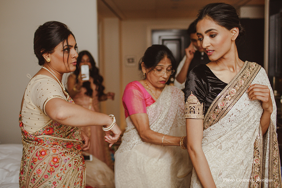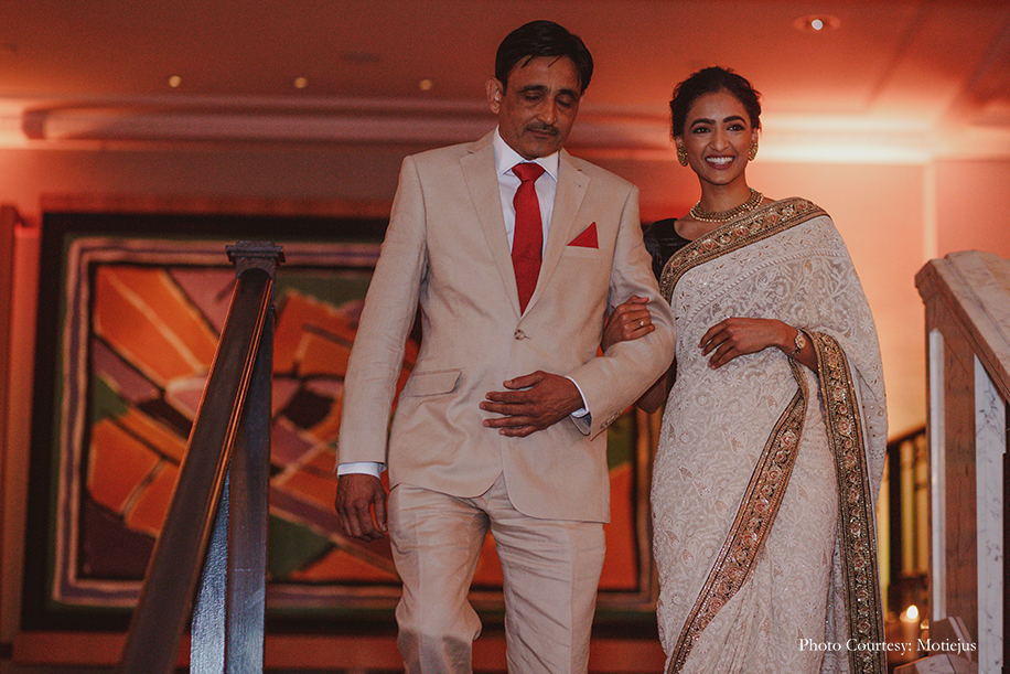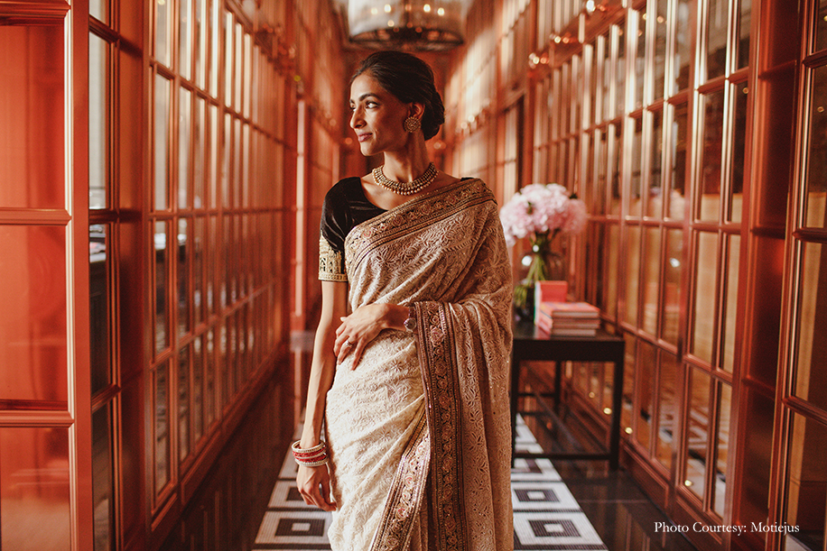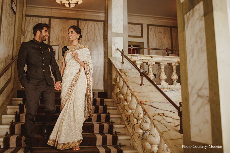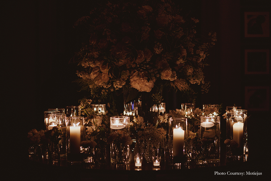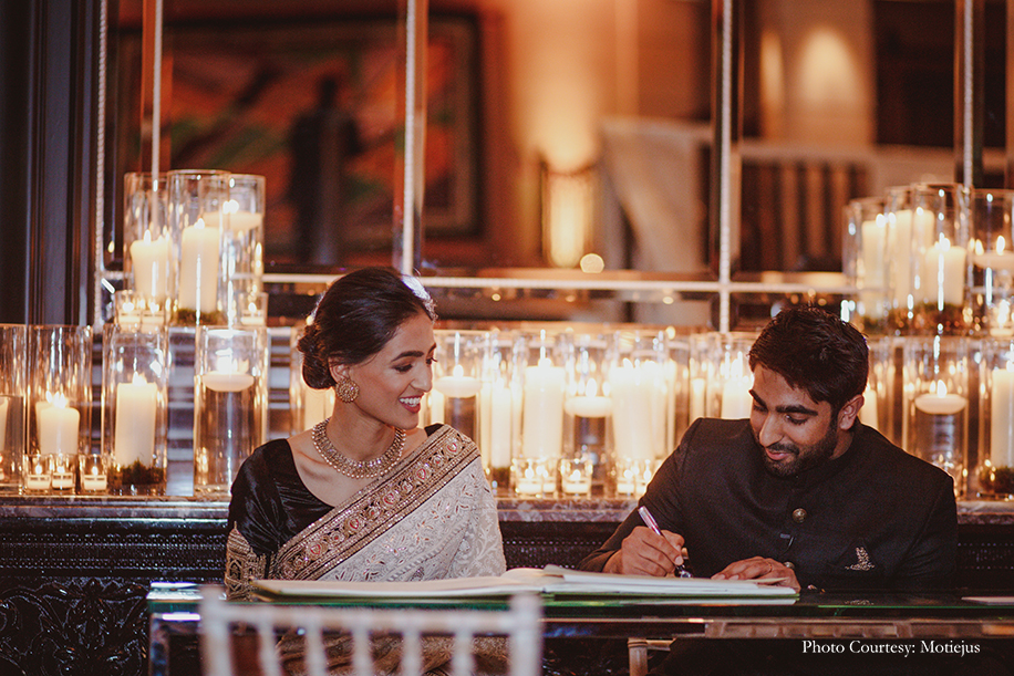 The vintage atmosphere and old-world charm of the Rosewood Hotel was accentuated with candles and white floral arrangements everywhere. The bride ditched a heavy lehenga for a timeless white Sabyasachi Mukherjee creation with intricate chikankari work. She accessorized her look with Cartier jewellery and family heirloom jewels, and flaunted a soft bun and demure makeup for an elegant visage. The groom wore a black bandh gala ensemble by Sabyasachi too.